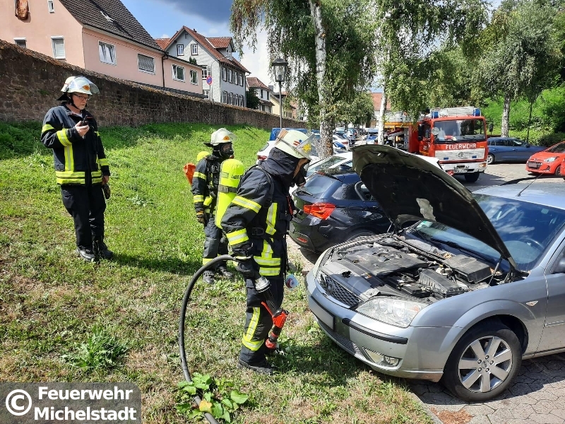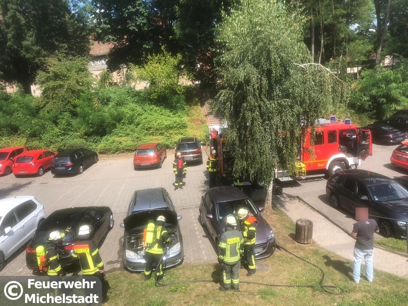 Auf dem Kellereibergparkplatz qualmte ein PKW im Motorraum, vermutlich durch einen Kabelbrand. Nachdem wir die Batterie abgeklemmt hatten, löschten wir den Brand mit dem Schnellangriff.