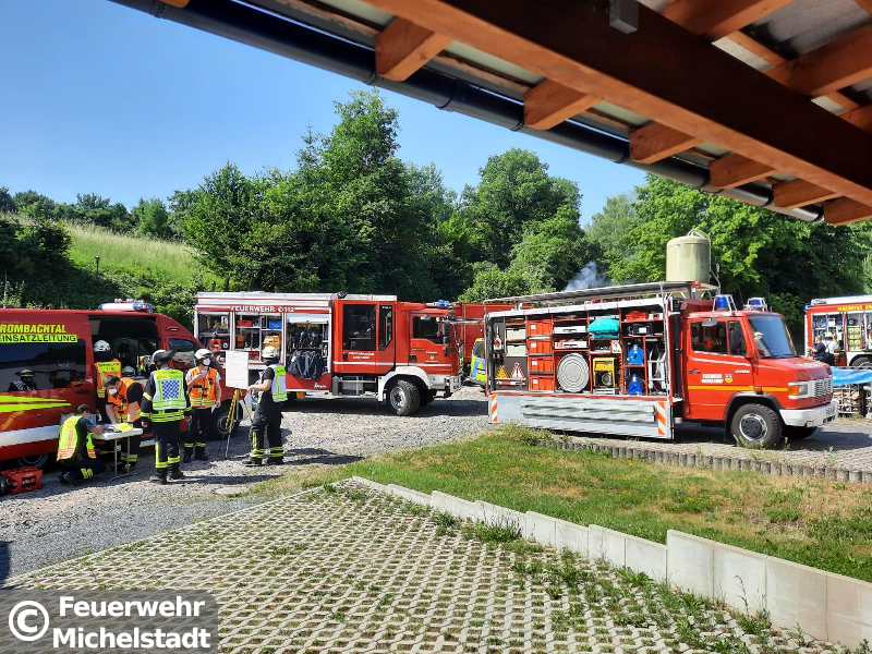 Es brannte eine Gefahrgutabsetzmulde mit Stückgut und Ölresten. Die Brandbekämpfung wurde von den Kameraden der Freiwilligen Feuerwehr Brombachtal durchgeführt. Wir führten als Teil der GABC-Messgruppe Probenahmen und Messungen durch. Als Teil des GABC-Zugs fingen wir zusätzlich das eingesetzte Löschwasser auf und standen für einen möglichen Stoffaustritt in Bereitschaft. Außerdem sicherten wir das Erdreich gegen das auslaufende Öl mit Planen und Ölbindemittel ab.
