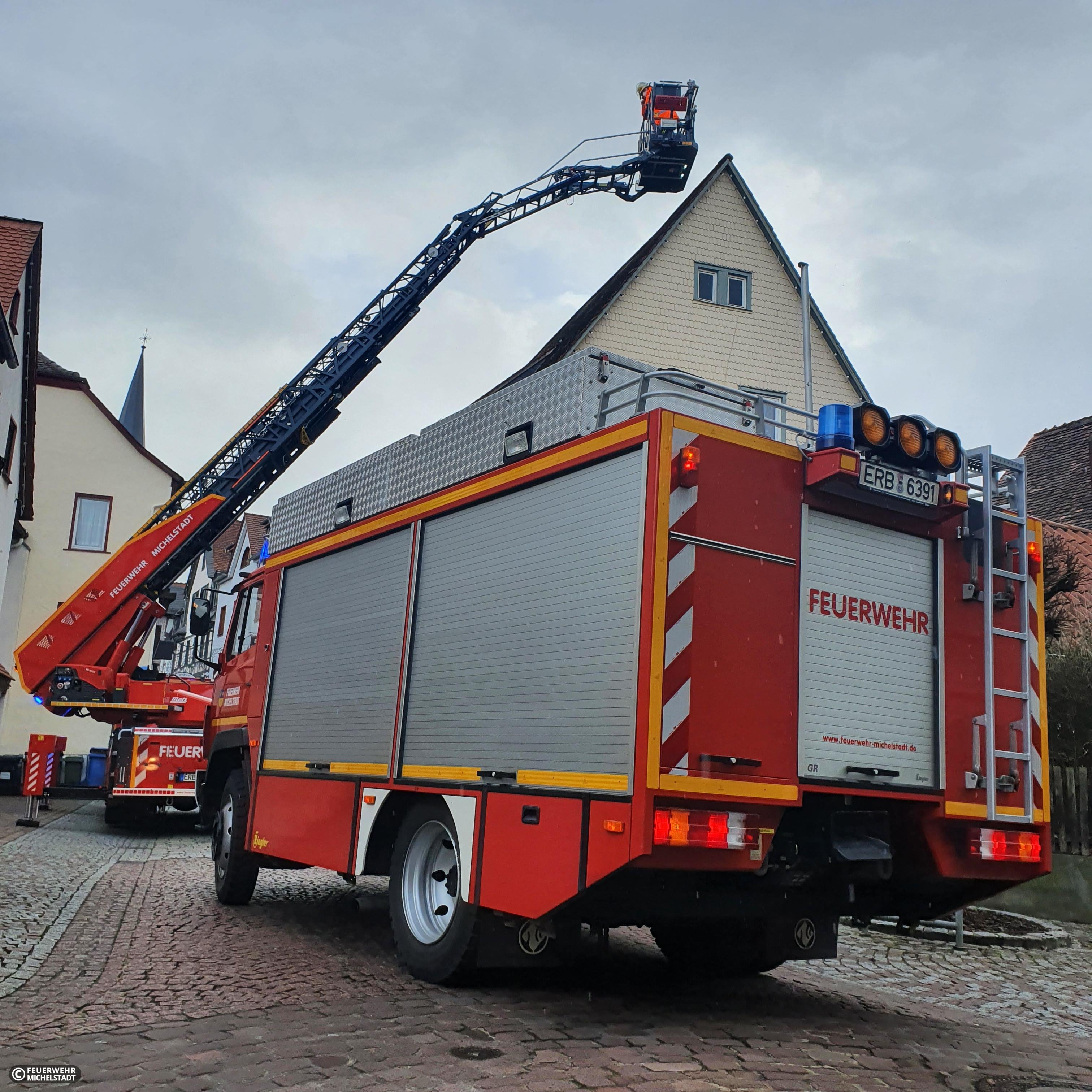 Auf einem Dach lösten sich durch den starken Wind einige Dachziegel und drohten auf die Straße zu fallen. Die Ziegel wurden mithilfe der Drehleiter entfernt und eine Fachfirma beim Verschließen des Daches unterstützt.