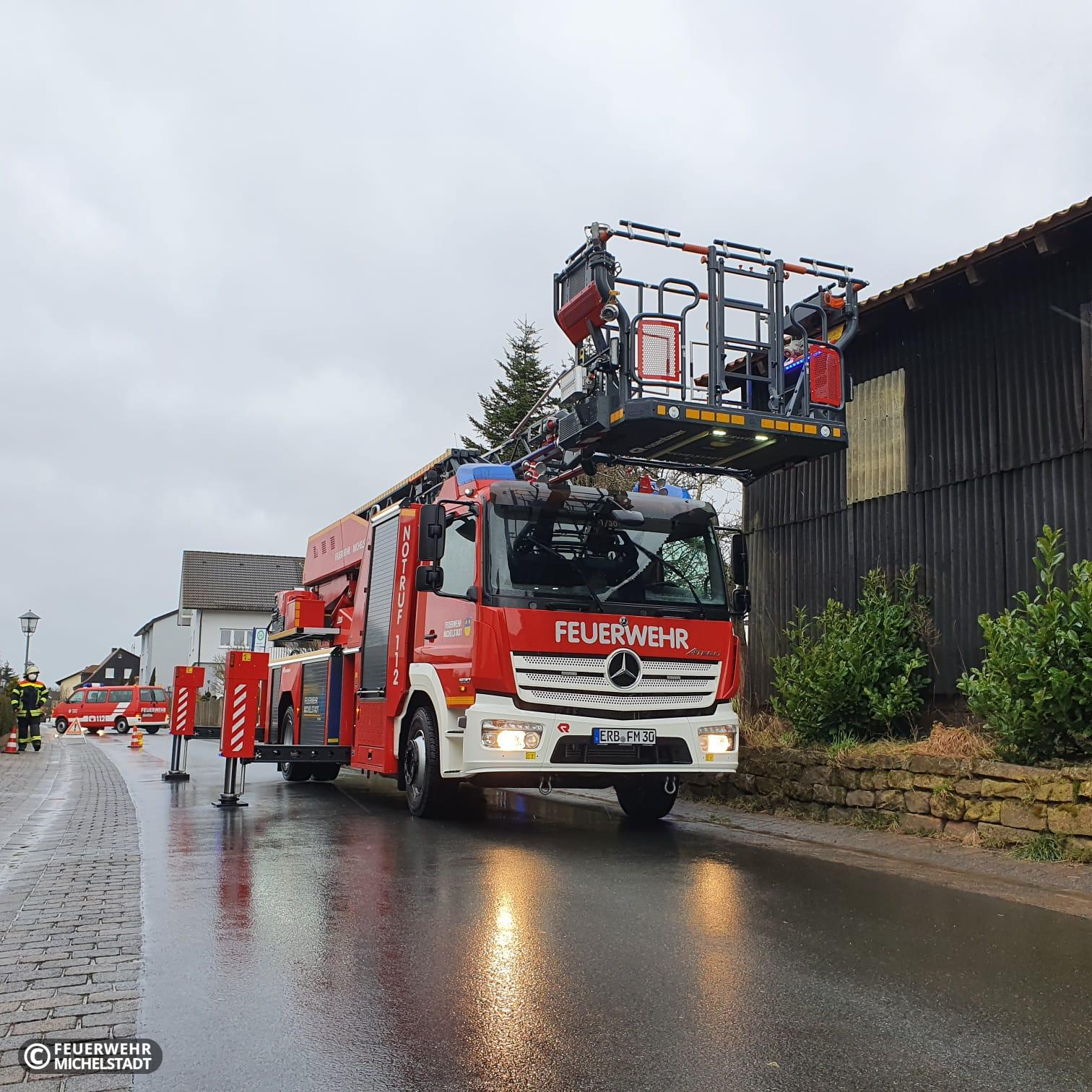 Auf einem Dach eines Wohnhauses waren Dachziegel locker und mussten mittels der Drehleiter gesichert werden.