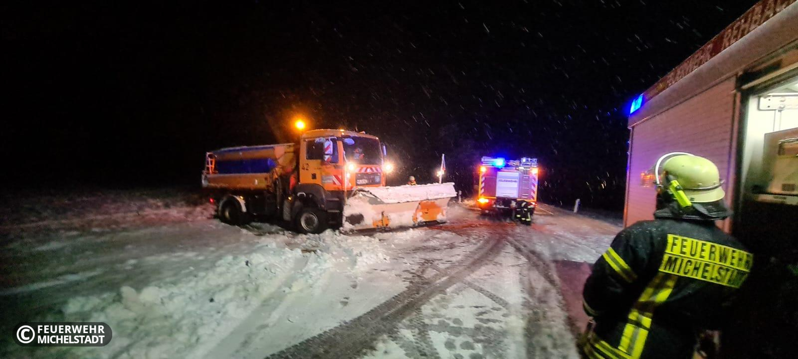 Ein Räumfahrzeug war von der Straße abgekommen und steckte fest. Wir unterstützten die Kameraden aus Rehbach bei der Bergung des Fahrzeugs mithilfe der Seilwinde des Rüstwagens.