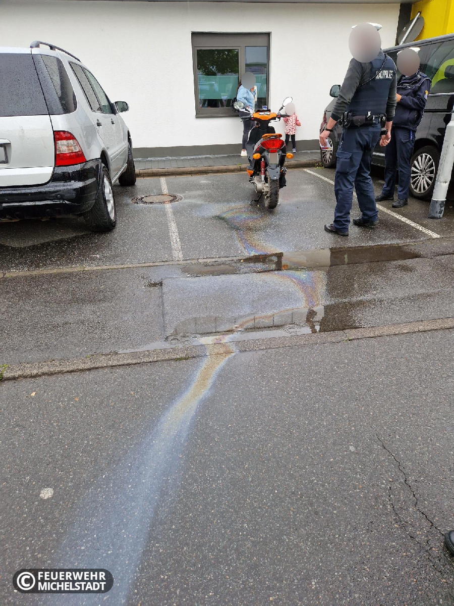 Aus einem Motorroller lief Kraftstoff aus. Der wachhabende Brandsicherheitsdienst auf dem Bienenmarkt streute die betroffenen Stellen ab.