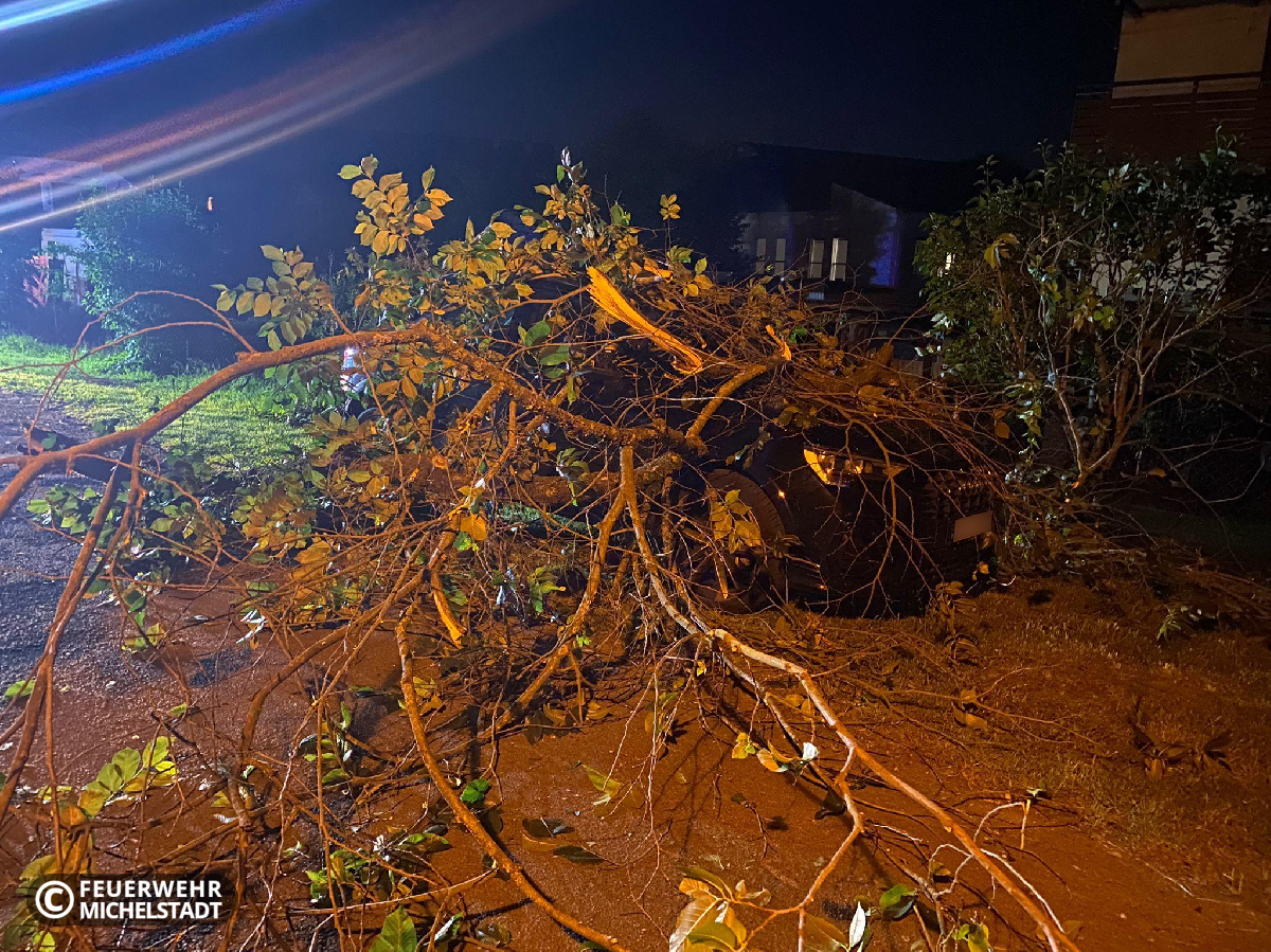 Durch einen herabgefallenen Ast wurde ein PKW beschädigt sowie die Fahrbahn versperrt.