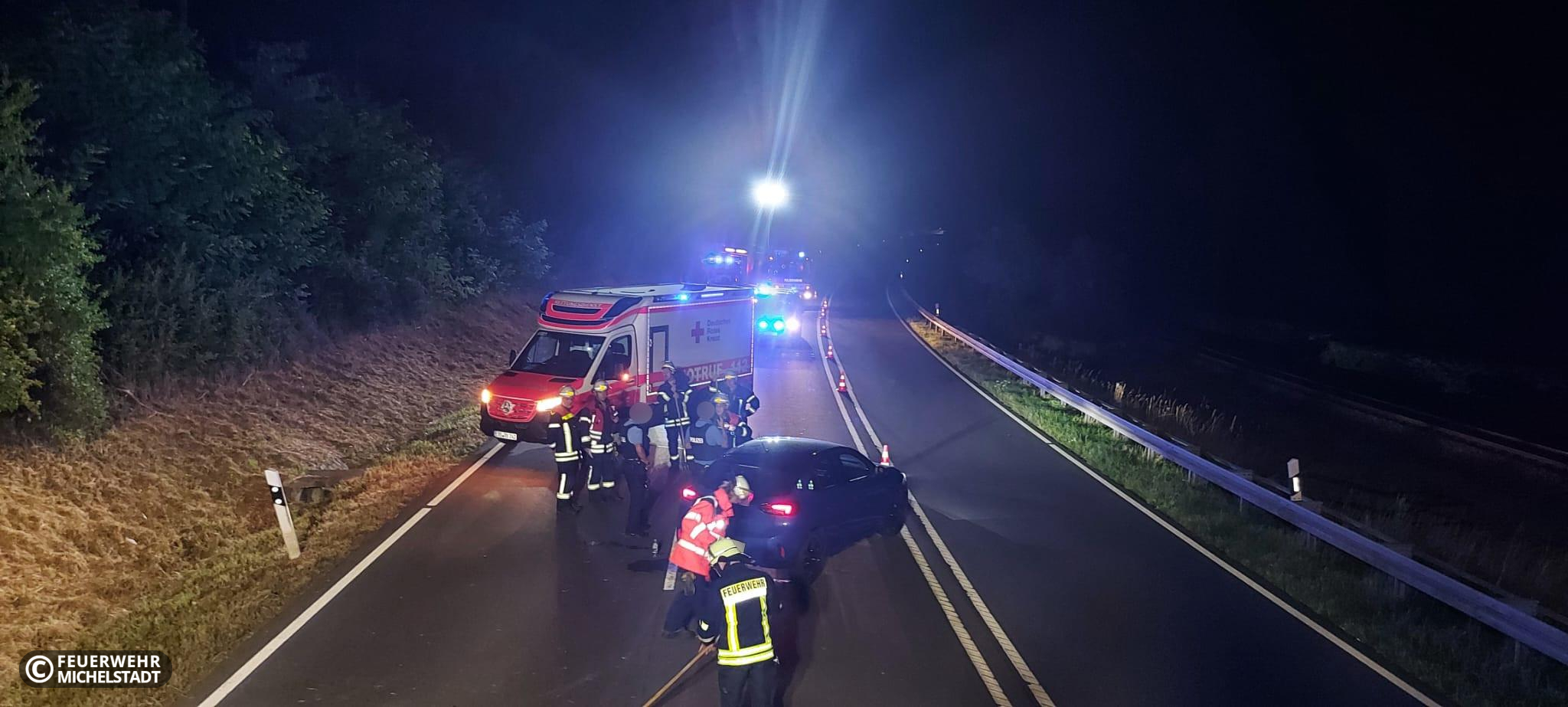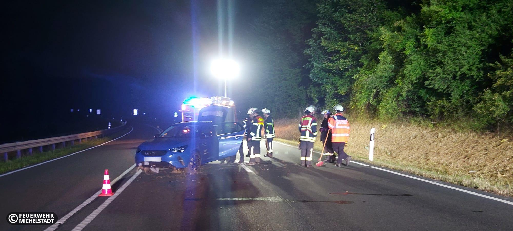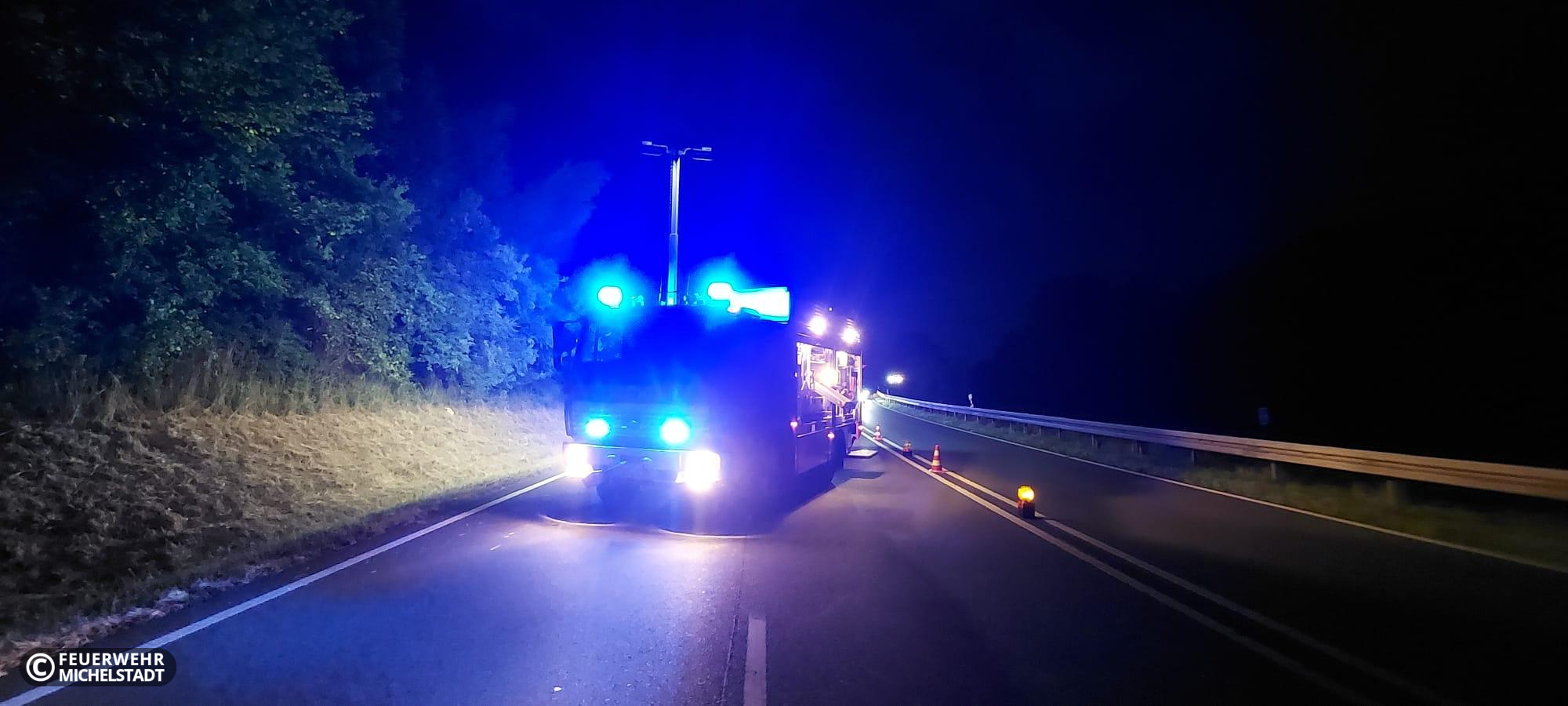 Es kam zu einem Verkehrsunfall mit einem PKW kurz vor dem Parkplatz zwischen Michelstadt und Zell. Unsere Maßnahmen bezogen sich auf das Absichern und Ausleuchten der Einsatzstelle sowie das Reinigen der Fahrbahn.