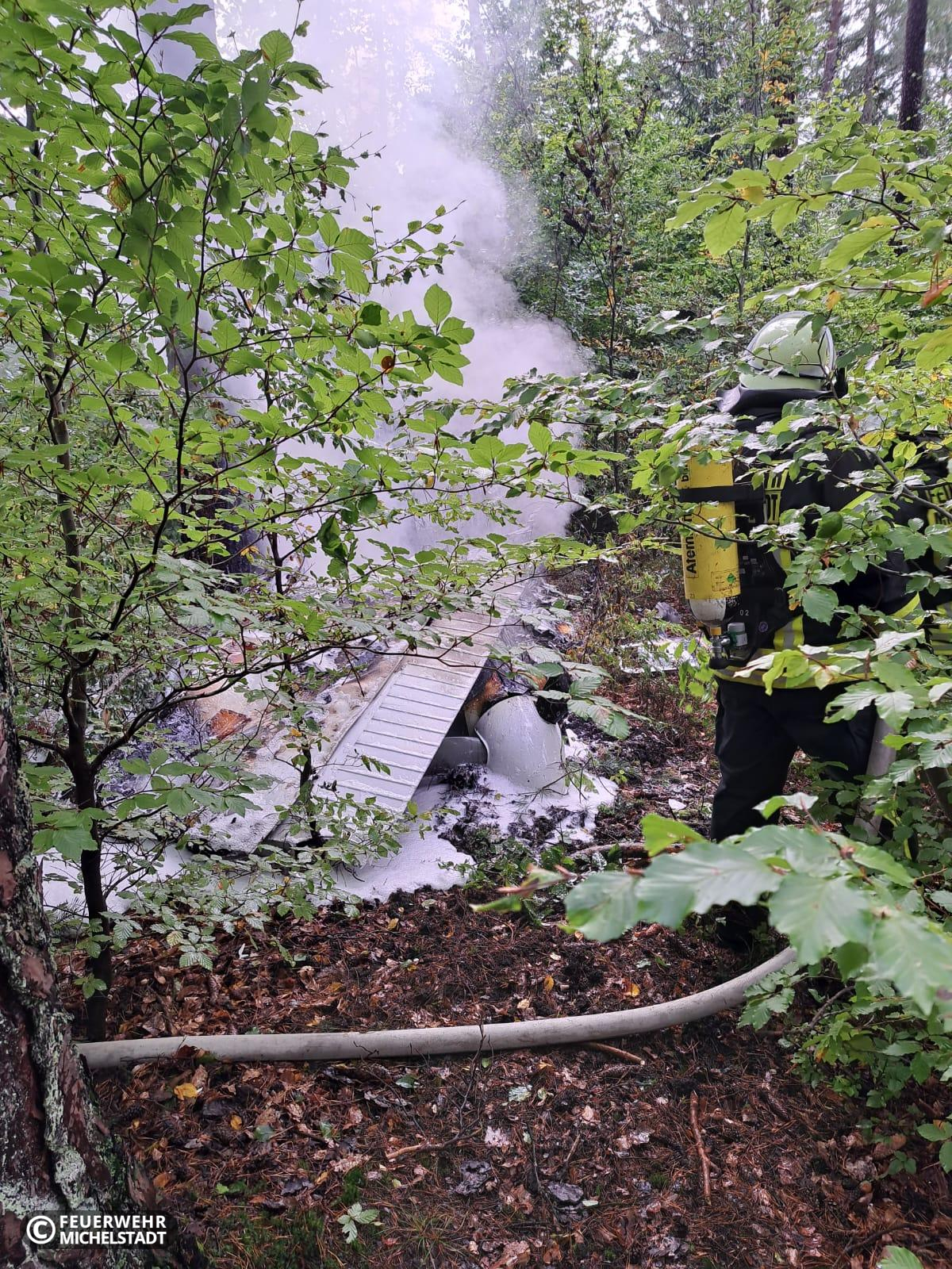 Ein Kleinflugzeug stürzte am Mittag in ein Waldstück nahe des Flugplatzes Vielbrunn. Die Maschine fing sofort Feuer und brannte aus. Als die Kameraden aus Vielbrunn kurze Zeit später eintrafen, kam leider jede Hilfe für den Piloten zu spät. Eine Ausbreitung des Brandes konnte verhindert werden.