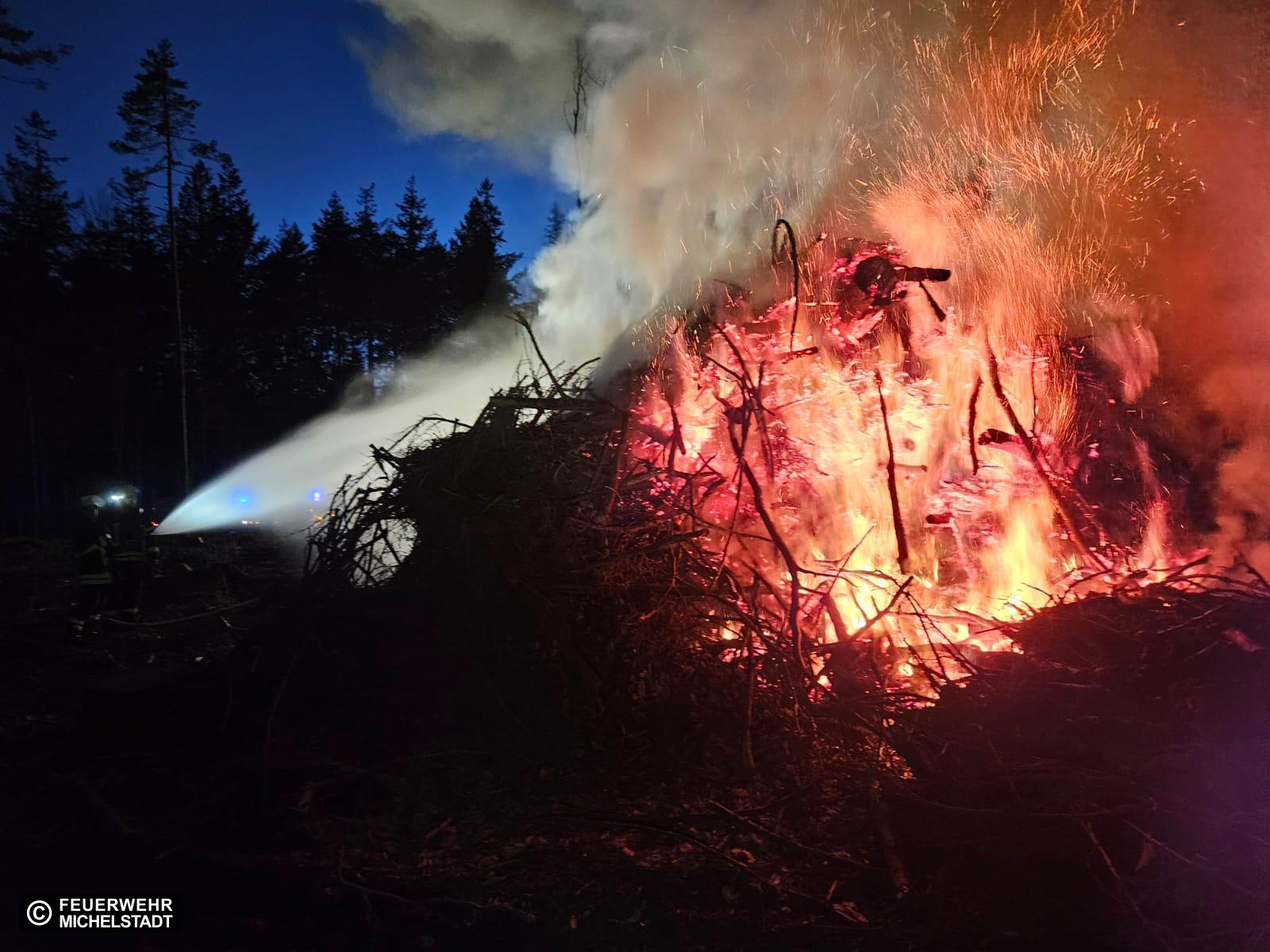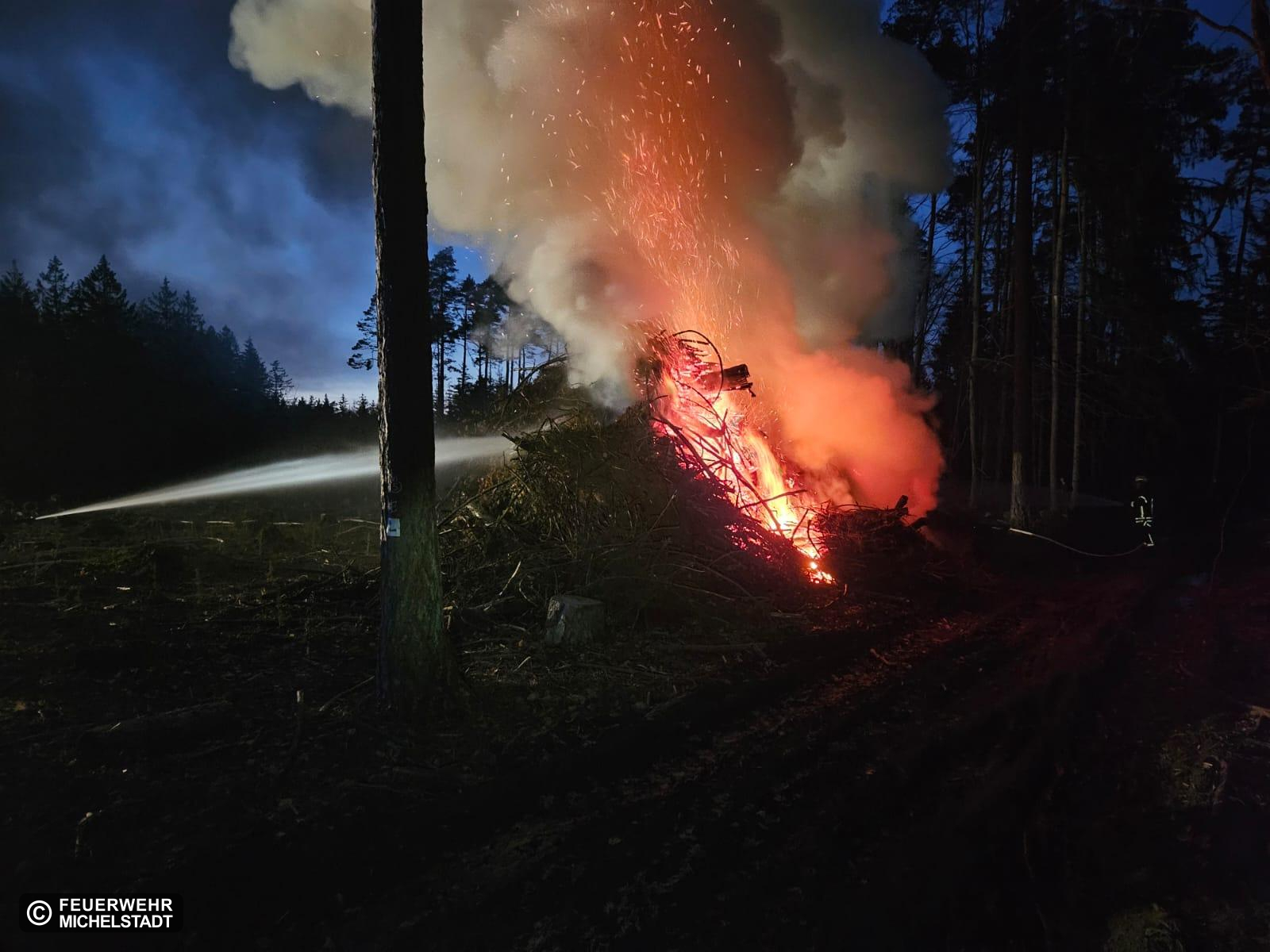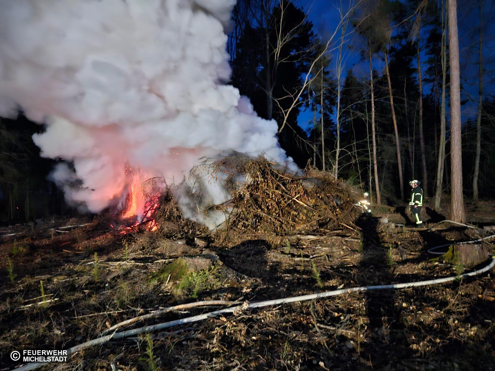 Es brannte ein größerer Haufen Reisig im Wald. Aufgrund der hohen Energie innerhalb des Haufens konnten wir diesen nicht ohne Weiteres ablöschen. Daher ließen wir ihn kontrolliert niederbrennen, bis ein Teleskoplader vor Ort war. Gemeinsam mit den Kameraden aus Vielbrunn löschten wir den Haufen Stück für Stück ab, während der Teleskoplader ihn auseinander zog.