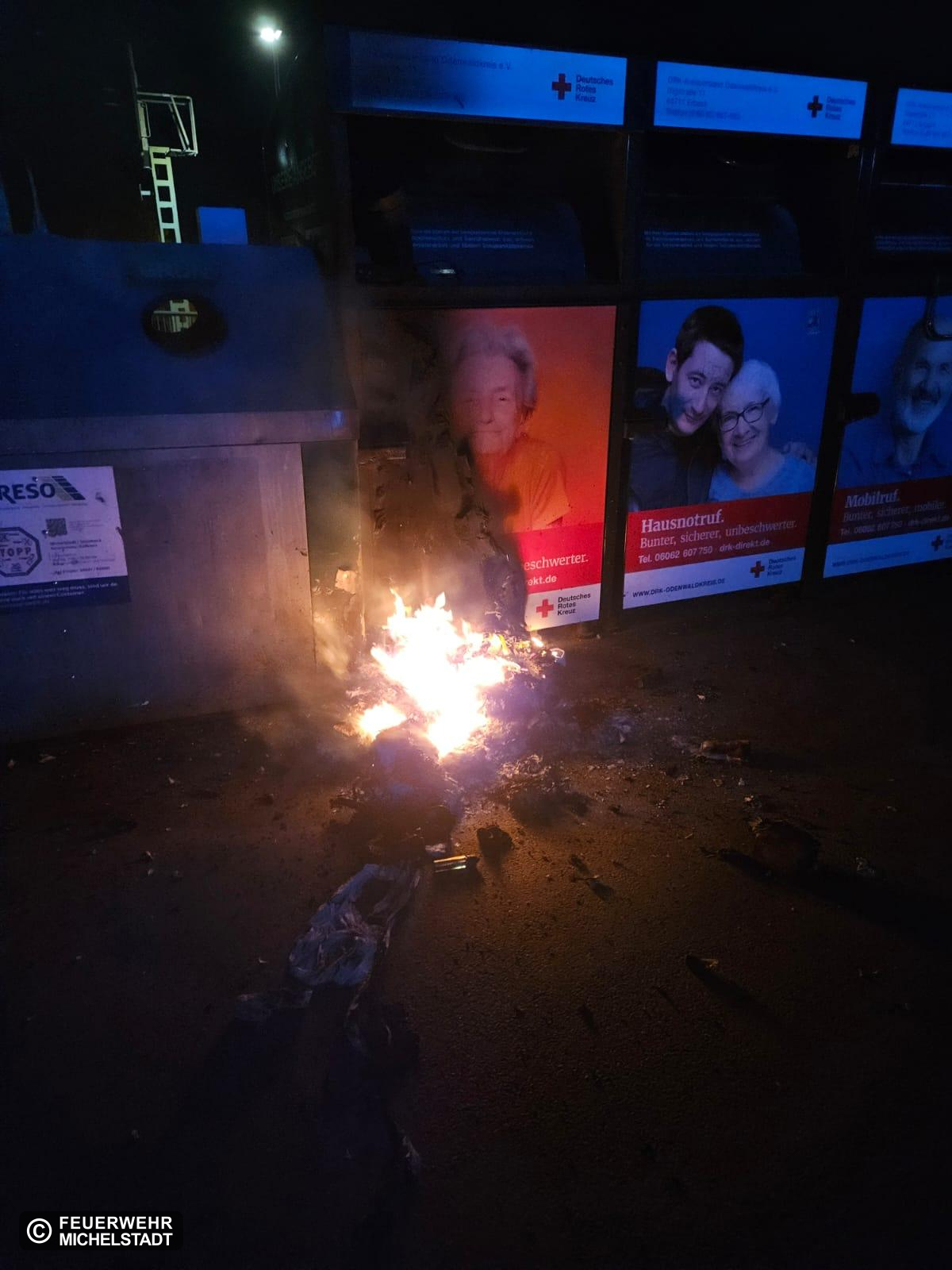Vor einem Altkleidercontainer am Bahnhof brannte Unrat. Wir löschten diesen mit dem Schnellangriff ab. Zusätzlich kontrollierten wir den Altkleidercontainer mit der Wärmebildkamera und fluteten diesen zur Sicherheit mit Wasser.