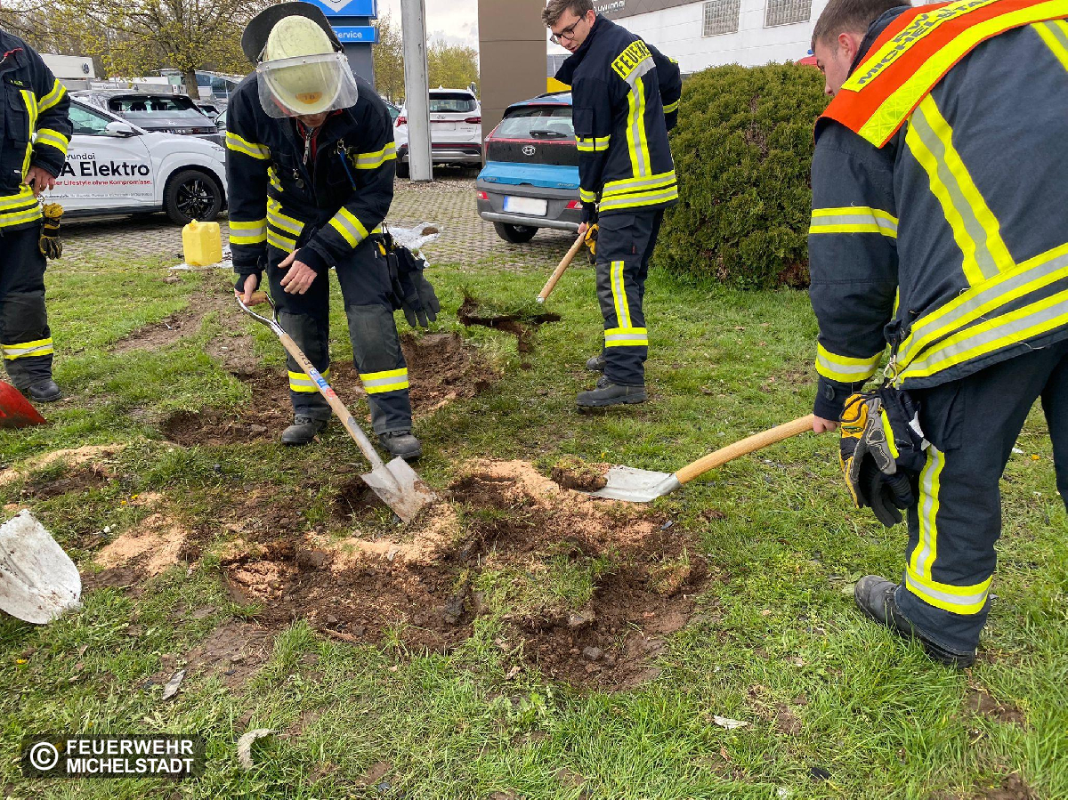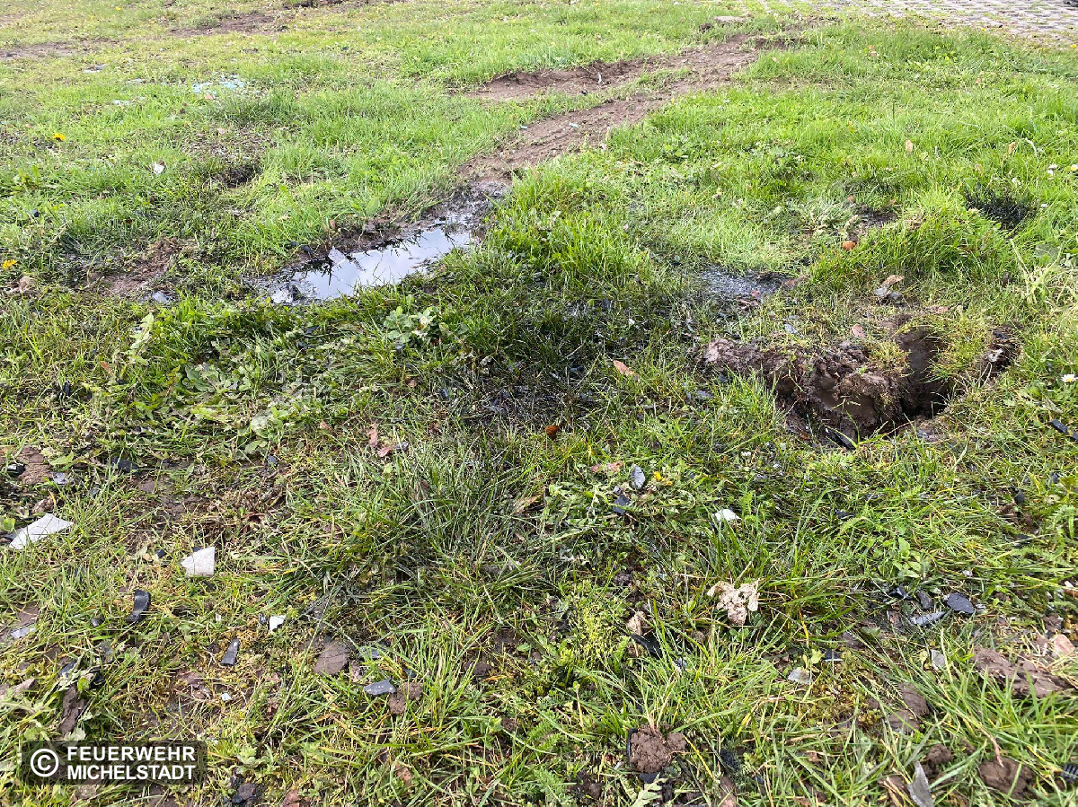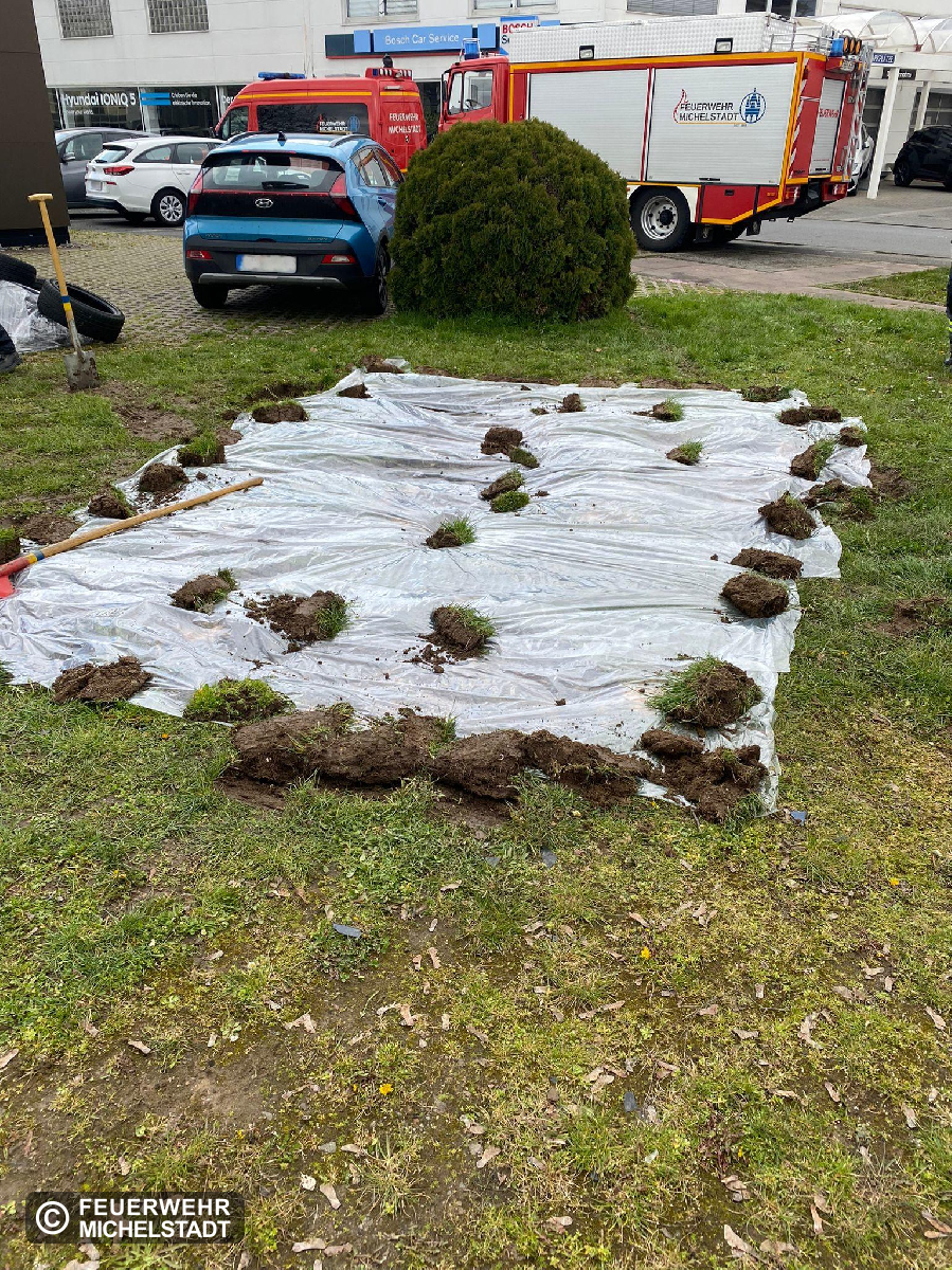 Nach der Bergung des Unfallfahrzeuges des vorherigen Einsatzes konnte ausgelaufenes Öl auf der Rasenfläche festgestellt werden. Wir trugen das betroffene Erdreich ab und sicherten es mit einer Plane. Nach dem Eintreffen der Unteren Wasserbehörde wurde die Einsatzstelle durch diese abgenommen und der betroffene Bereich zusätzlich mit einer Plane abgedeckt.