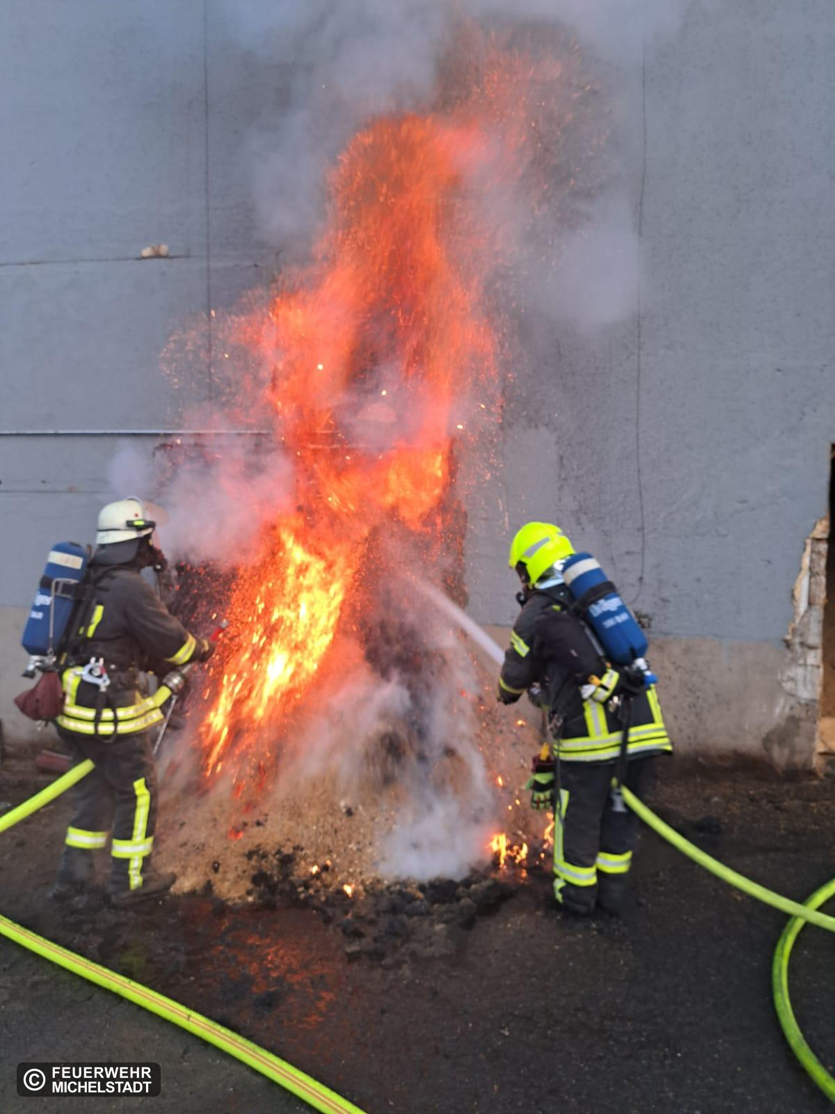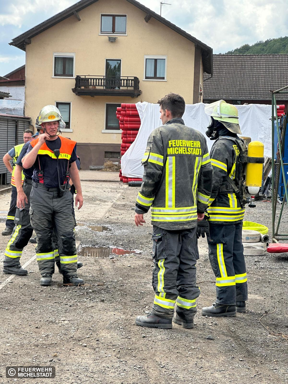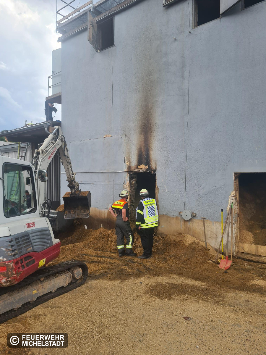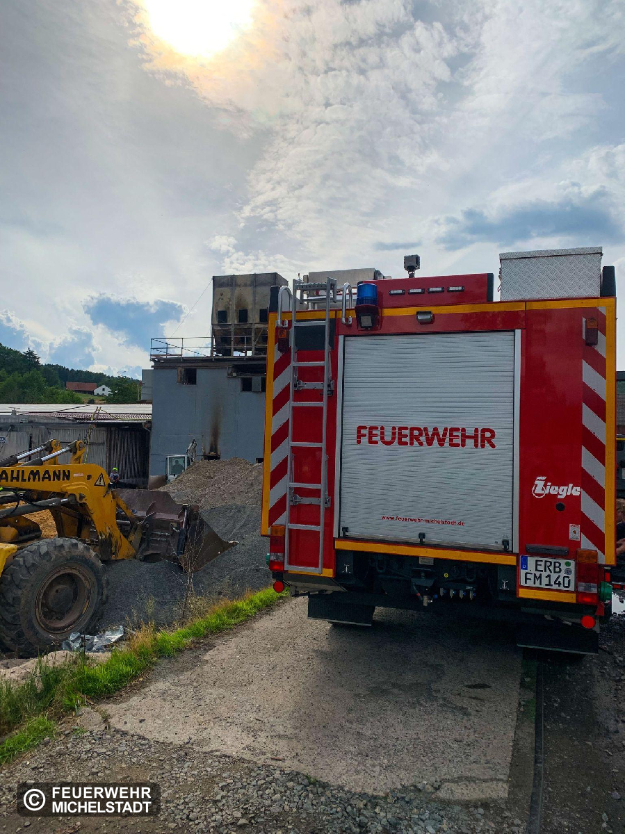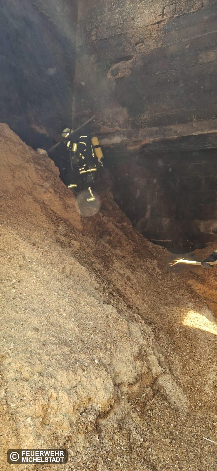 Da das Spänelager des vorherigen Einsatzes nicht abgelöscht werden konnte, ohne dieses zu leeren, wurden wir mit Atemschutzgeräteträgern alarmiert, um den immensen Kräftebedarf zu decken. Vor Ort lösten wir die Kameradinnen und Kameraden ab, die bereits seit den Morgenstunden mit dieser Aufgabe beschäftigt waren. Insgesamt setzten wir zwei mal vier Trupps ein, welche jeweils 20 bis 30 Minuten im Einsatz waren. In Handarbeit wurde so über den Tag das gesamte Lager entleert. Wir wurden gegen etwa 17 Uhr durch Einsatzkräfte der Feuerwehr Höchst abgelöst.