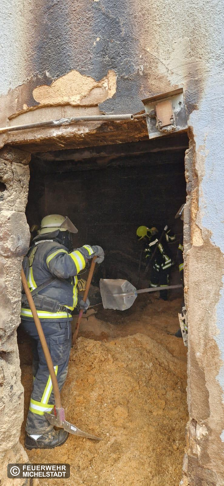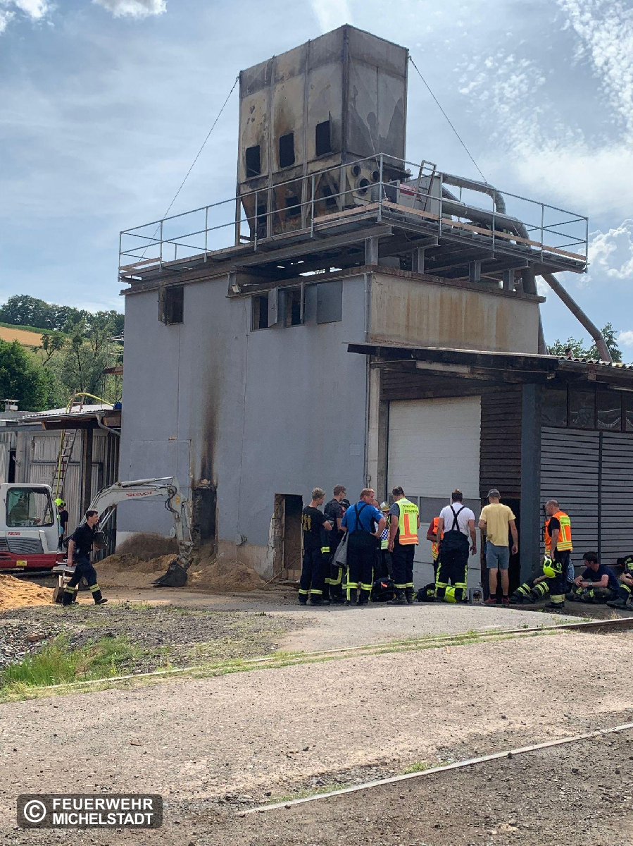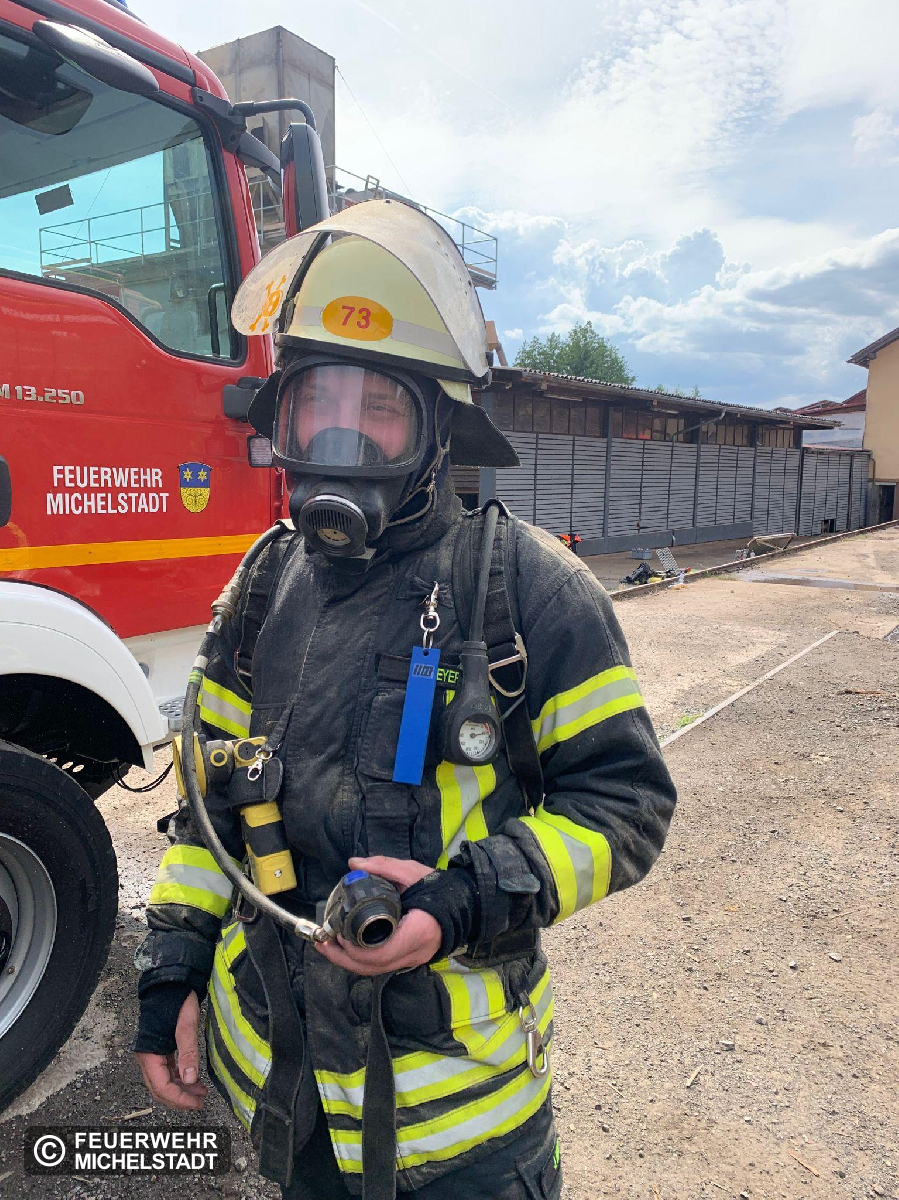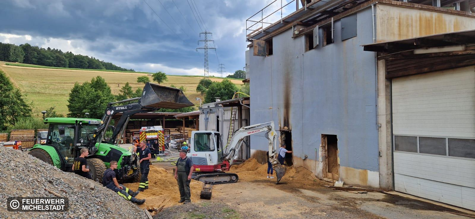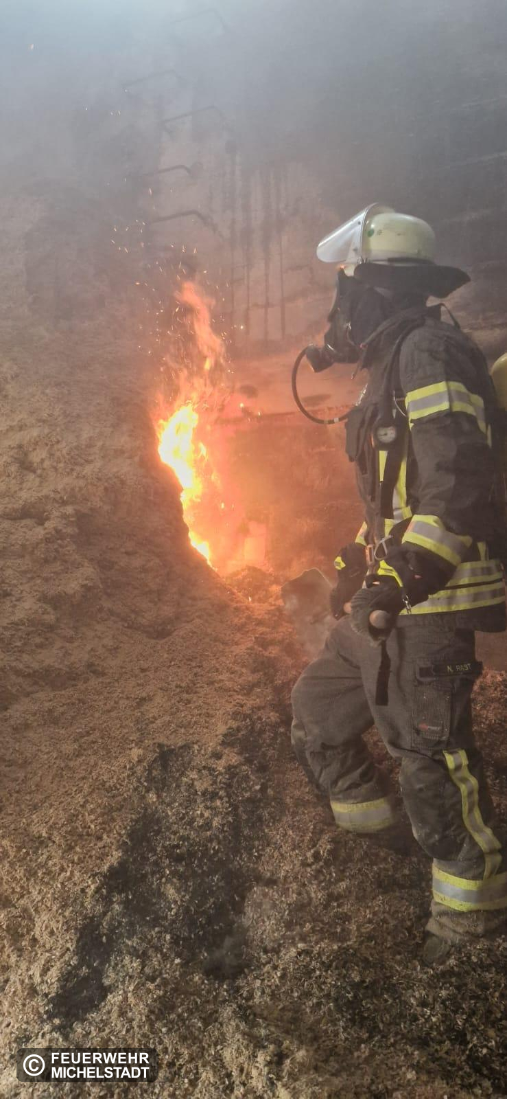 Da das Spänelager des vorherigen Einsatzes nicht abgelöscht werden konnte, ohne dieses zu leeren, wurden wir mit Atemschutzgeräteträgern alarmiert, um den immensen Kräftebedarf zu decken. Vor Ort lösten wir die Kameradinnen und Kameraden ab, die bereits seit den Morgenstunden mit dieser Aufgabe beschäftigt waren. Insgesamt setzten wir zwei mal vier Trupps ein, welche jeweils 20 bis 30 Minuten im Einsatz waren. In Handarbeit wurde so über den Tag das gesamte Lager entleert. Wir wurden gegen etwa 17 Uhr durch Einsatzkräfte der Feuerwehr Höchst abgelöst.