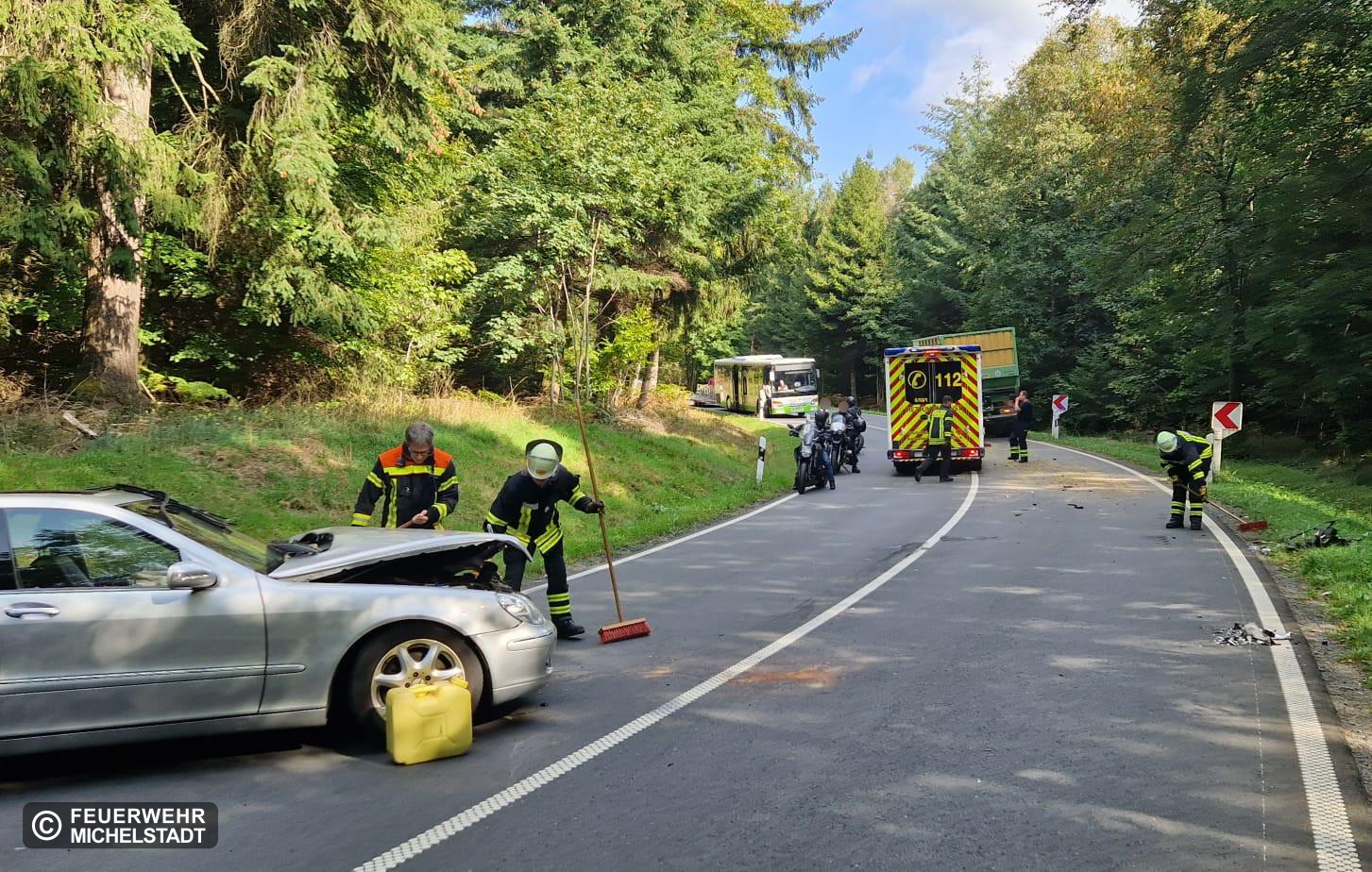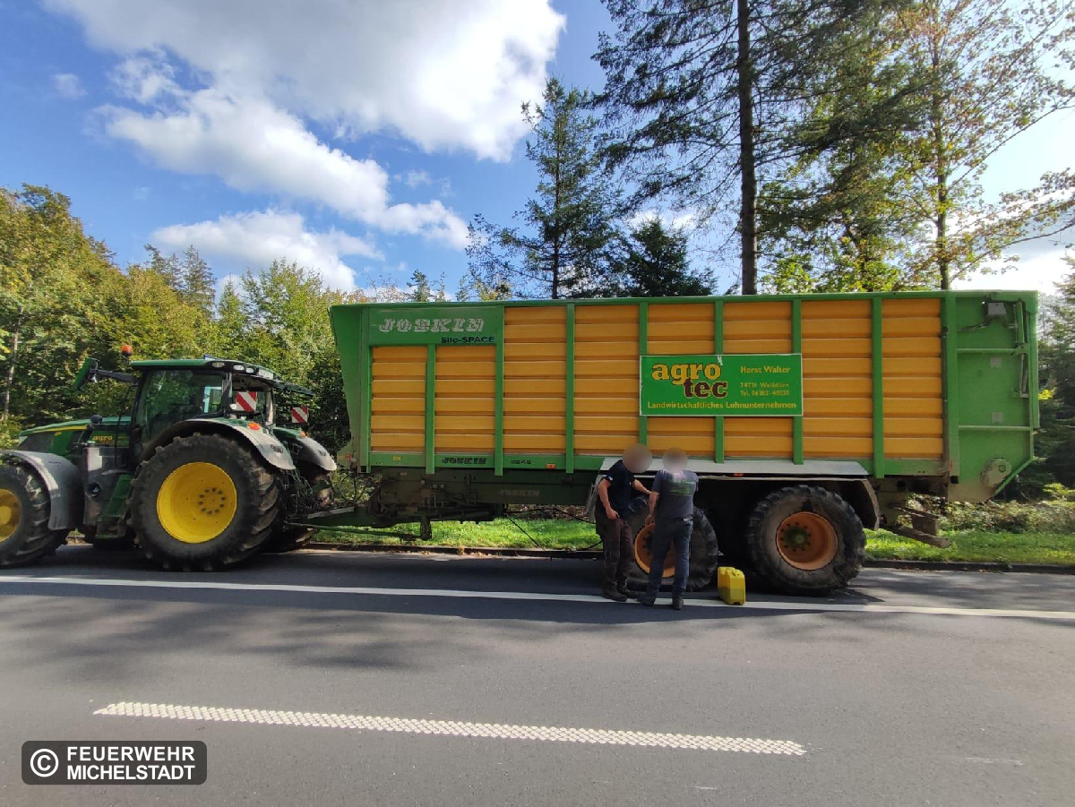 Ein PKW ist mit einem landwirtschaftlichen Anhänger kollidiert. Vor Ort wurden auslaufende Betriebsstoffe aufgenommen, der Verkehr abgesichert und die Fahrbahn gereinigt.