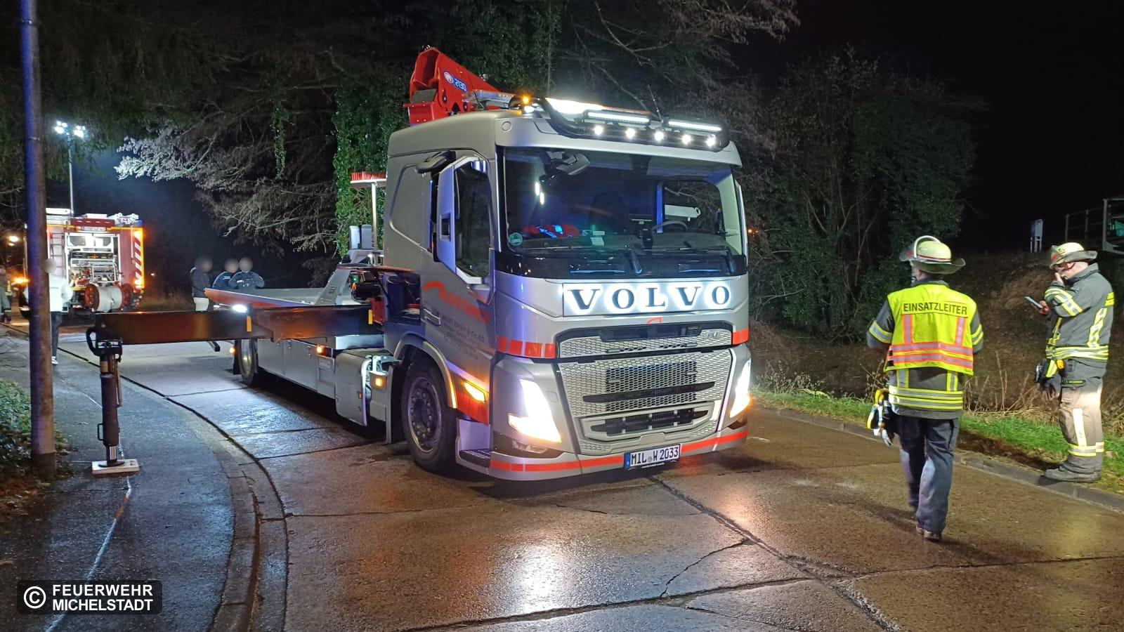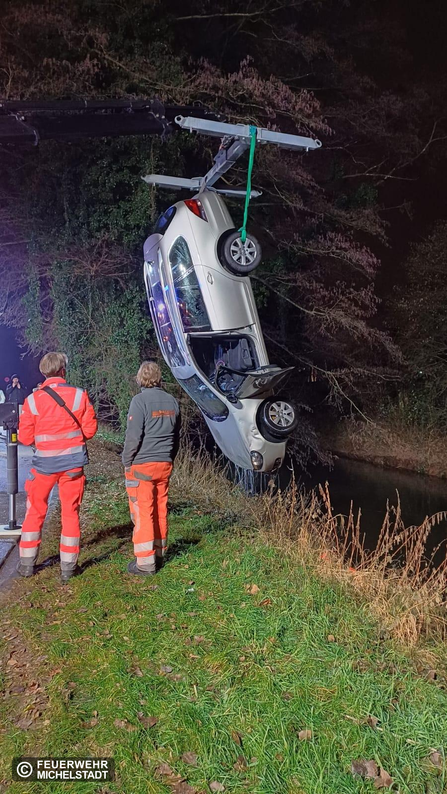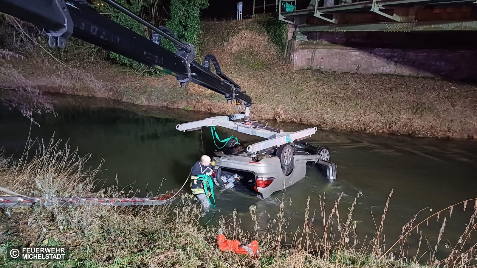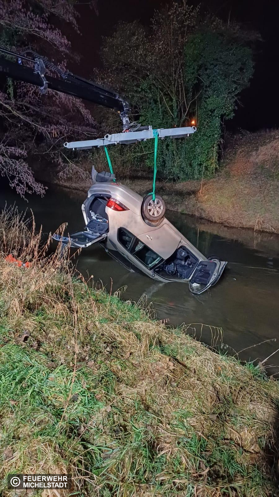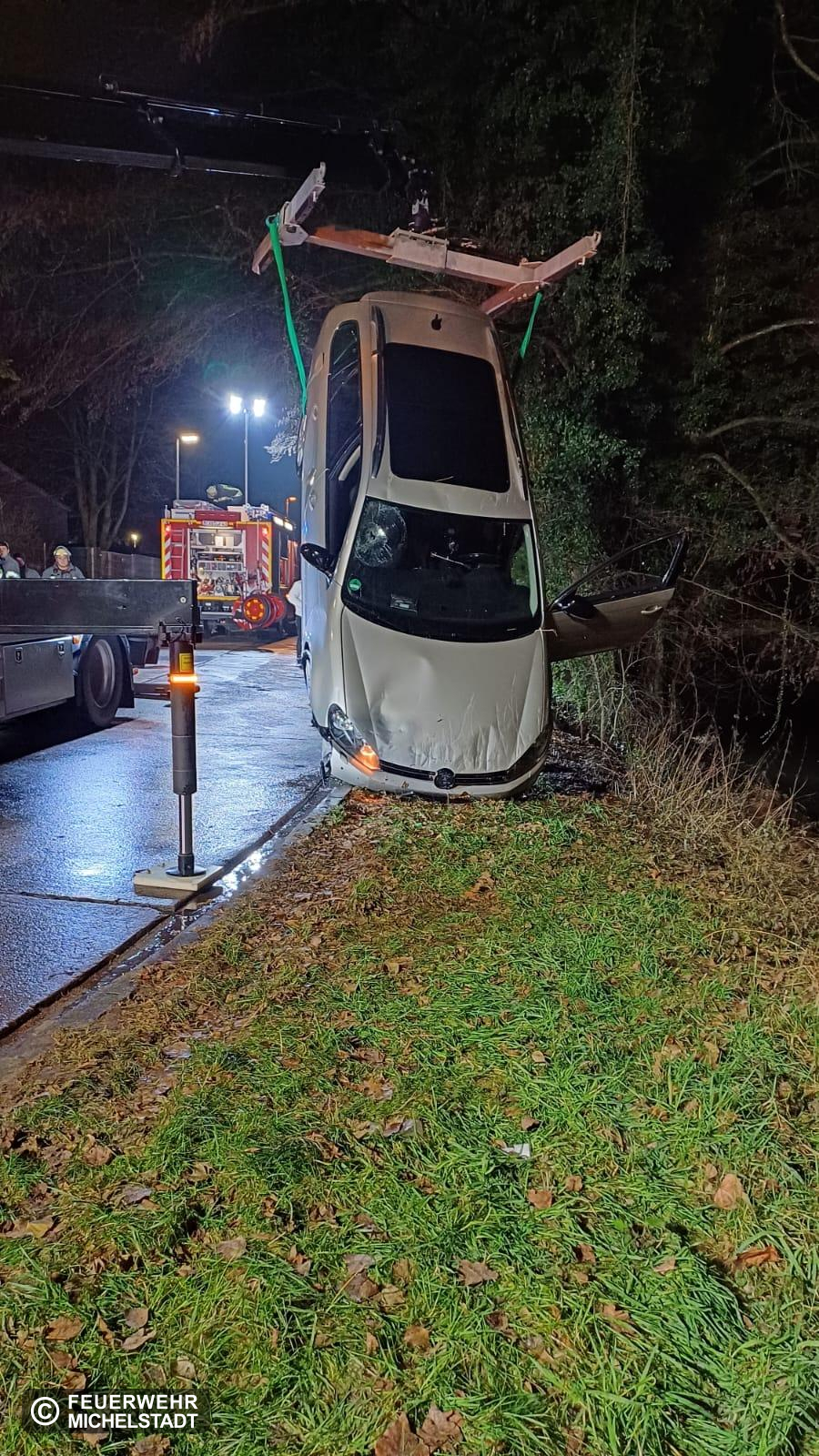 Eine Person kam mit ihrem PKW von der Fahrbahn ab. Der PKW landete in der Mümling. Die Person konnte sich selbstständig befreien. Nach unserem Eintreffen betreuten wir die Person bis zum Eintreffen des Rettungsdienstes. Außerdem sicherten wir die Einsatzstelle ab und leuchteten diese aus. Abschließend unterstützten wir das Bergungsunternehmen bei der Bergung des PKW.