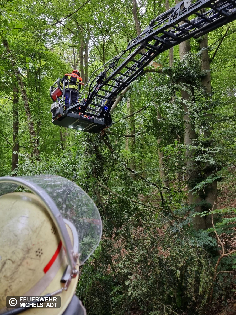 Wir unterstützten die Kameraden aus Höchst mit der Drehleiter bei der Entfernung einer Baumkrone. Da sich die Drehleiter aus Höchst aktuell in Reparatur befindet, wurden wir zur Unterstützung gerufen.
