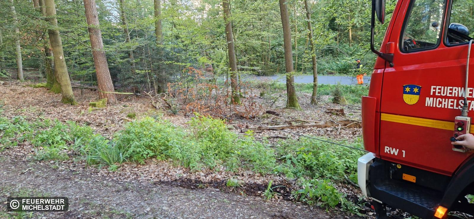 Über der Fahrbahn hing ein Baum, welcher herabzustürzen drohte. HessenMobil wurde nachgefordert. Anschließend wurde der Baum durch uns mittels maschineller Zugeinrichtung angeschlagen und mit der Kettensäge entfernt.