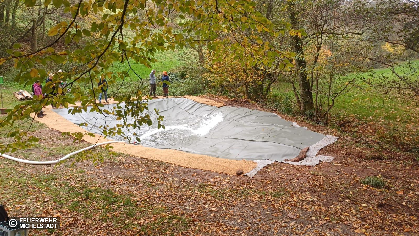 Nach Absprache füllten wir ein Feuchtbiotop für den NABU am Ponyhof mit unserem Tanklöschfahrzeug.