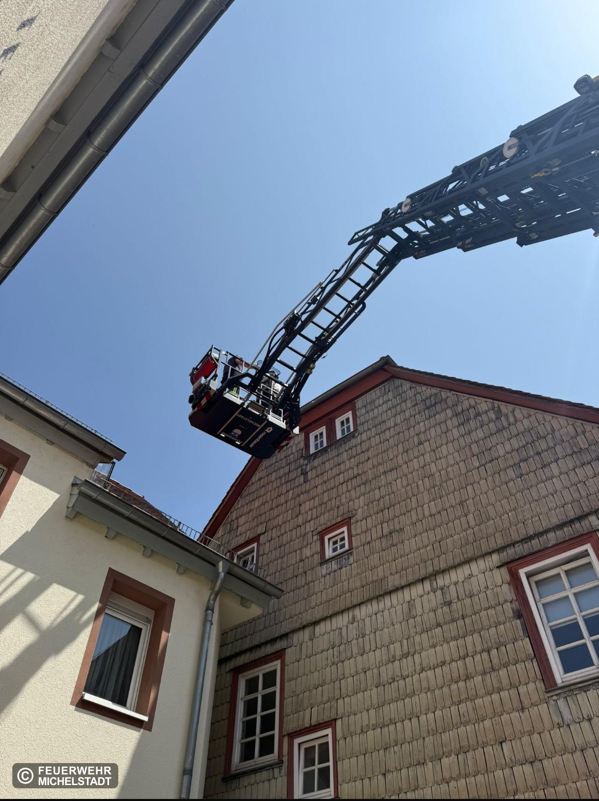 In einem Holzspalt am Dach war ein Vogel eingeklemmt und konnte sich alleine nicht befreien. Mit der Drehleiter wurde angeleitert und der Vogel befreit. Anschließend wurde er einer Tierarztpraxis zugeführt. Es handelt sich vermutlich um einen Verletzten Mauersegler.