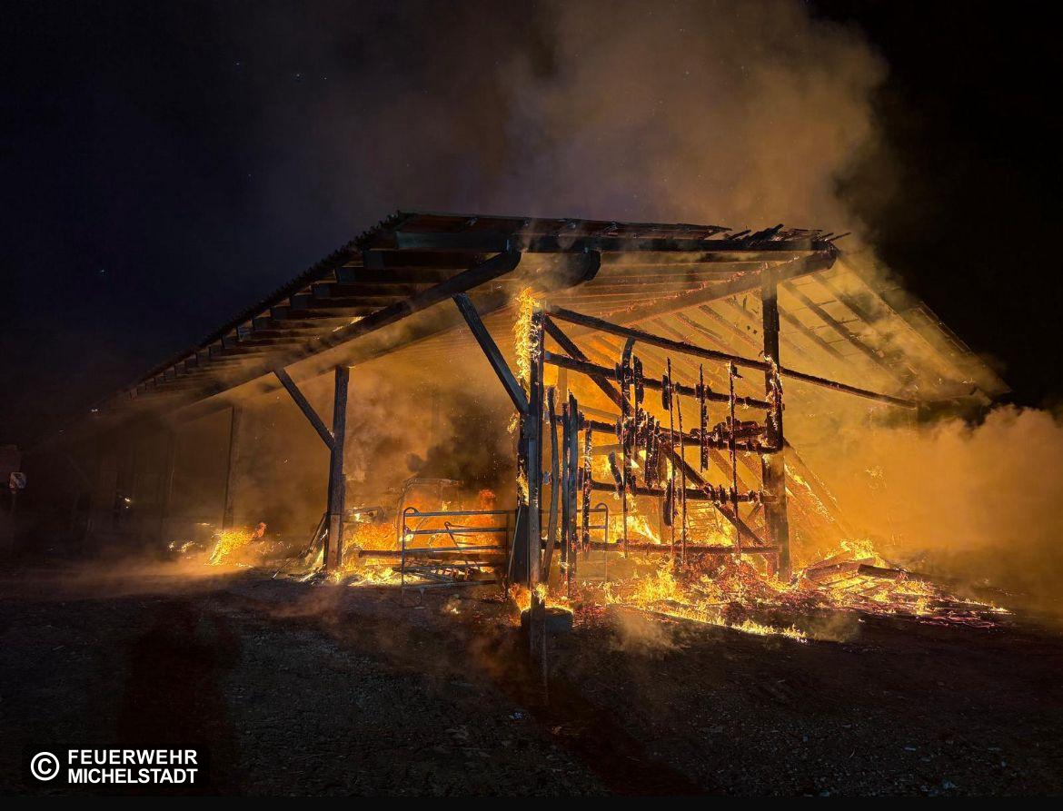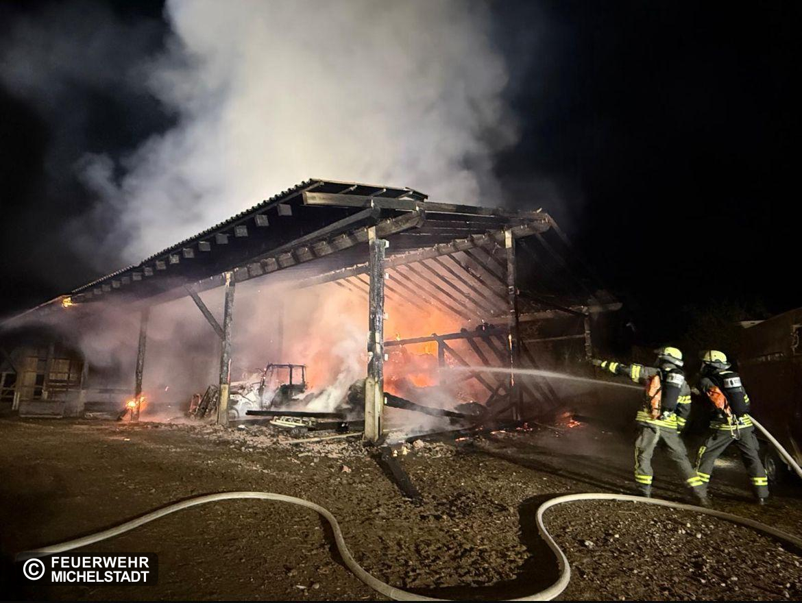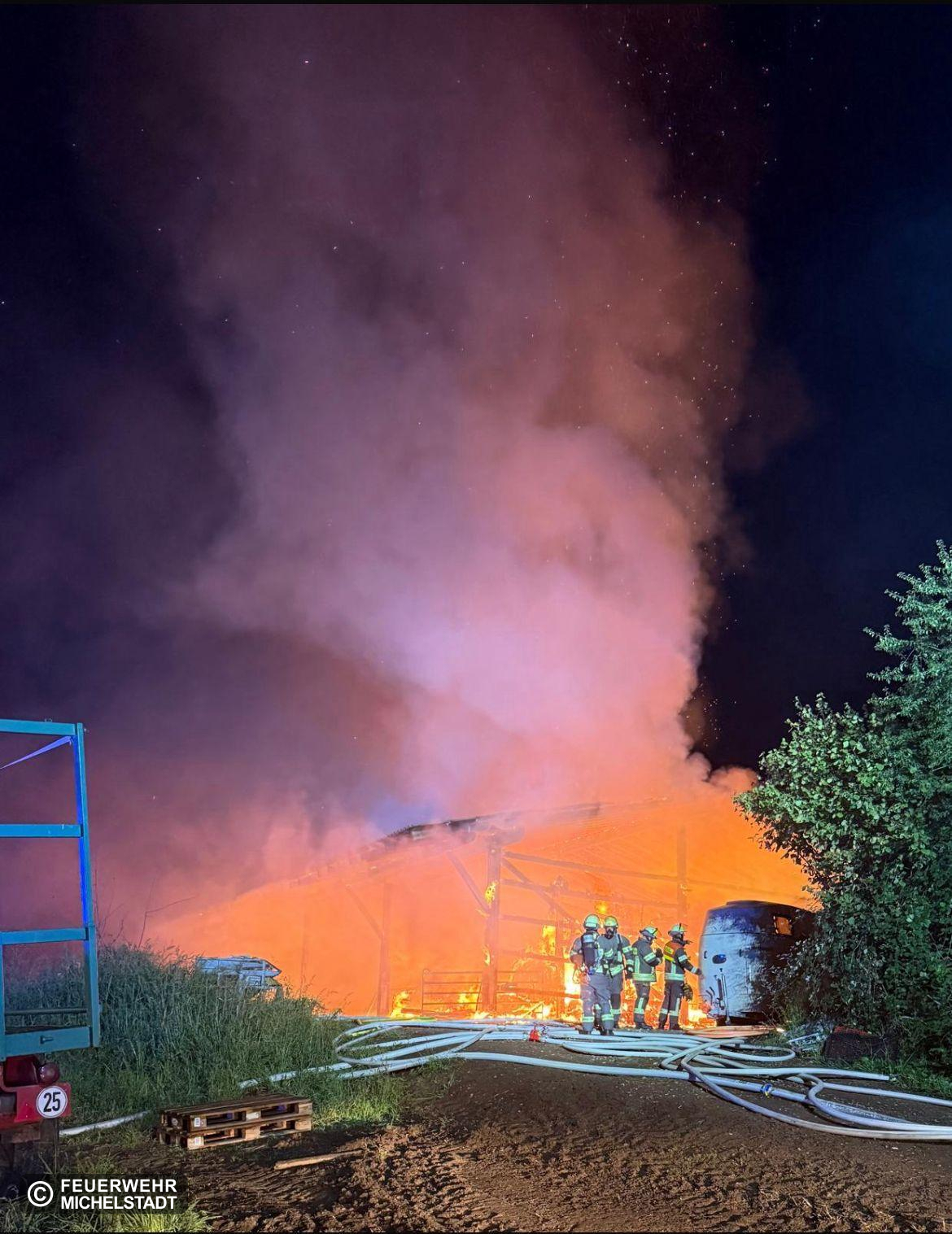 Um 23:04 Uhr wurde die Michelstädter Feuerwehr zu einem Brand einer landwirtschaftlichen Scheune alarmiert. Bereits auf der Anfahrt war zu erkennen, dass sich das Gebäude in Vollbrand befand. Umgehend wurde die Brandbekämpfung mittels drei C-Rohren, sowie über das Wenderohr der Drehleiter vorgenommen und ein Pendelverkehr für Löschwasser eingerichtet. Hier wurden neben dem Tanklöschfahrzeug aus Michelstadt auch die TLF´s der Feuerwehren Erbach und Bad König eingesetzt. Um weitere Atemschutzgeräteträger an der Einsatzstelle bereitzustellen, wurden die Feuerwehren Steinbach, Stockheim und Weiten-Gesäß nachalarmiert. Für ausreichend Atemschutzgeräte sorgte der Abrollbehälter Atemschutz der Feuerwehr Erbach, welche einen Abschnitt Logistik führte und sich hier auch um Nachschub von Verbrauchsmaterial und Verpflegung kümmerte. Um zunächst die eingesetzten Kräfte mit warmen Getränken zu versorgen, wurde die DRK-Bereitschaft Michelstadt alarmiert. Im Verlauf die Verpflegungsgruppe des DRK-Bad König, welche gemeinsam mit dem DRK-Höchst die Verpflegung sicherstellte. Das Gebäude musste zur Brandbekämpfung niedergelegt werden. Nachdem der Fachberater des THW Michelstadt an der Einsatzstelle eingetroffen war, wurde über die Leitstelle Odenwald die Fachgruppen Räumen des THW Groß- Gerau sowie Pfungstadt mit Kettenbagger und Radlader angefordert. Aufgrund des Einsatzes von Löschschaum war die Untere Wasserbehörde des Odenwaldkreises sowie der Wassermeister der Stadt Michelstadt an der Einsatzstelle. Insgesamt waren mit den Stadtbrandinspektoren, Kreisbranmeistern sowie dem Rettungsdienst 104 Einsatzkräfte im Einsatzgeschehen gebunden. Gegen 9 Uhr am Morgen, nach 10 Stunden Einsatz, konnten die Einsatzkräfte den Weg nach Hause antreten.