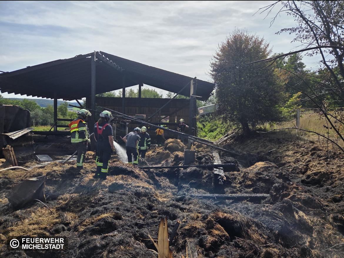 Am 07.09.2025 um 12:33 Uhr wurde die Feuerwehr Michelstadt mit dem Stichwort F2 – Rauchentwicklung erneut in den Kappenrainweg alarmiert. An der Einsatzstelle des Großbrandes aus der Nacht von Freitag auf Samstag wurde eine Rauchentwicklung gemeldet. Beim Eintreffen stellten die Einsatzkräfte einzelne Glut- und Rauchstellen im Strohabraum fest. Das Material wurde mithilfe von Dungharken auseinandergezogen und anschließend gründlich abgelöscht, um ein erneutes Aufflammen zu verhindern.
