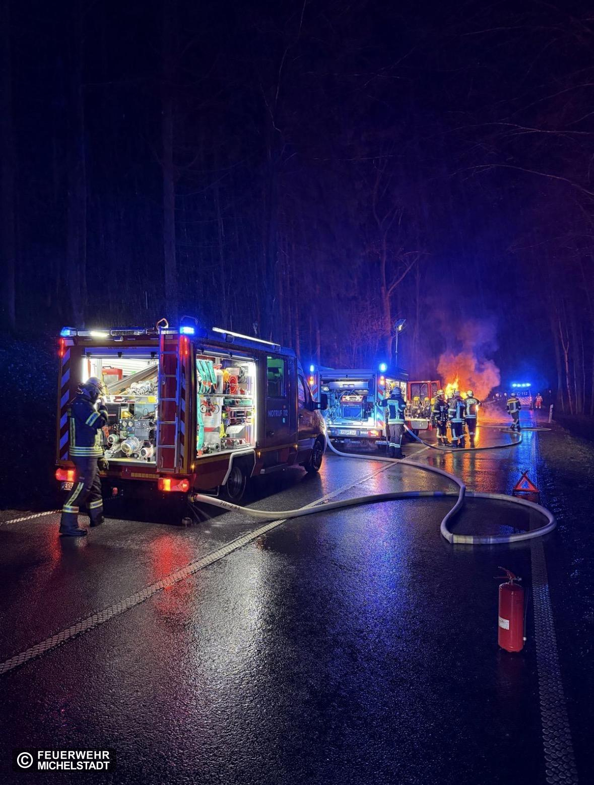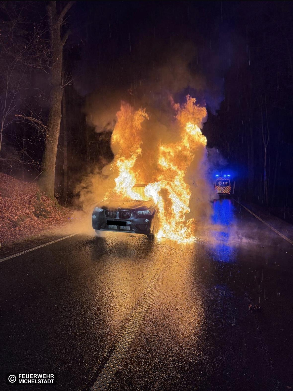 Gemeinsam mit der Feuerwehr Rehbach wurde der Fahrzeugbrand bekämpft und die Einsatzstelle abgesichert und ausgeleuchtet.