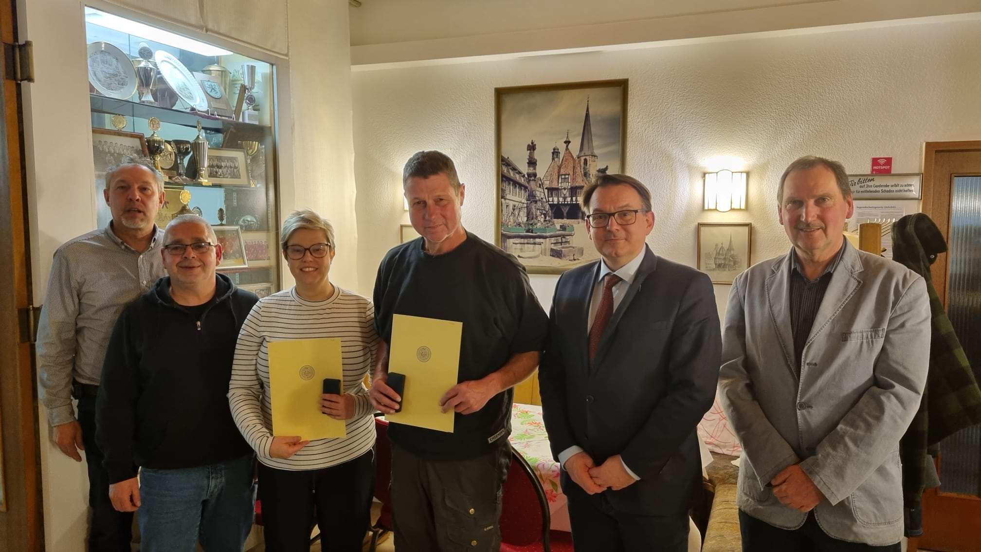 V.l.n.r.: Thomas Reubold (Wehrführer), Volker Fink (stv. Wehrführer), Desiree Heß, Thomas Müller, Dr. Tobias Robischon (Bürgermeister), Bernd Keller (i. V. für den Stadtverordnetenvorsteher)