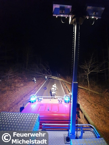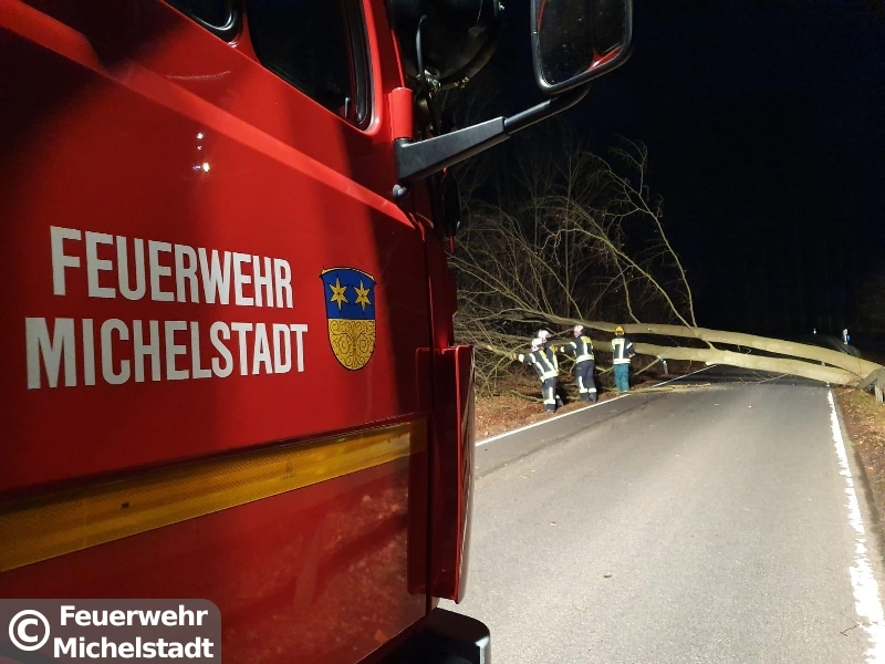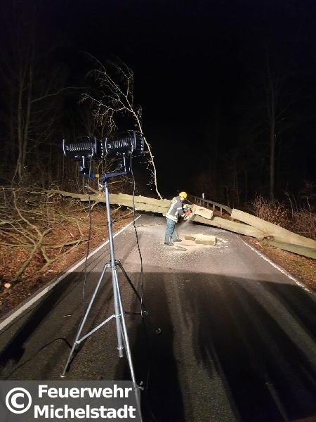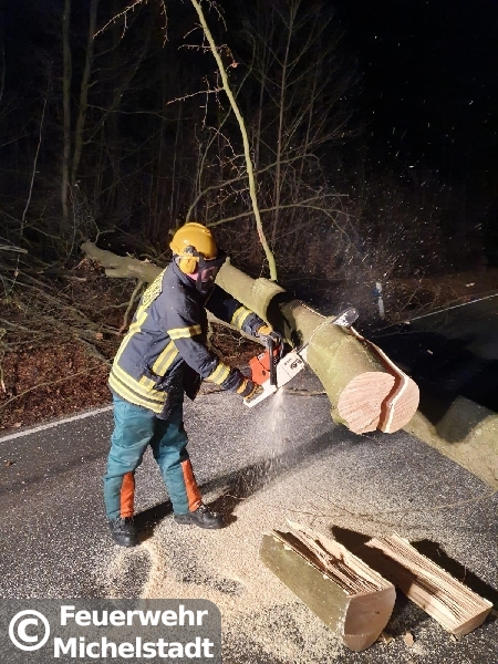 Eine Buche blockierte die komplette Fahrbahn und wurde mittels Motorkettensäge entfernt.