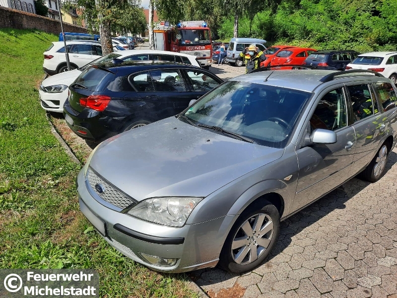 Auf dem Kellereibergparkplatz qualmte ein PKW im Motorraum, vermutlich durch einen Kabelbrand. Nachdem wir die Batterie abgeklemmt hatten, löschten wir den Brand mit dem Schnellangriff.