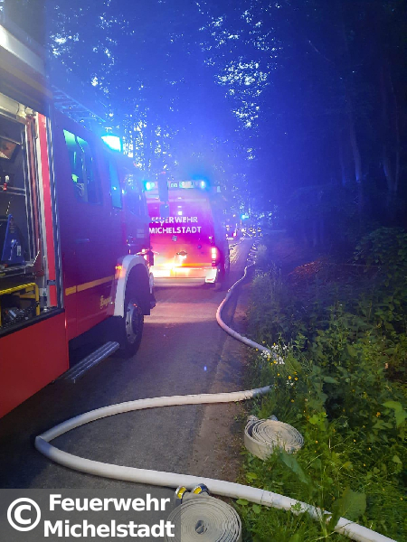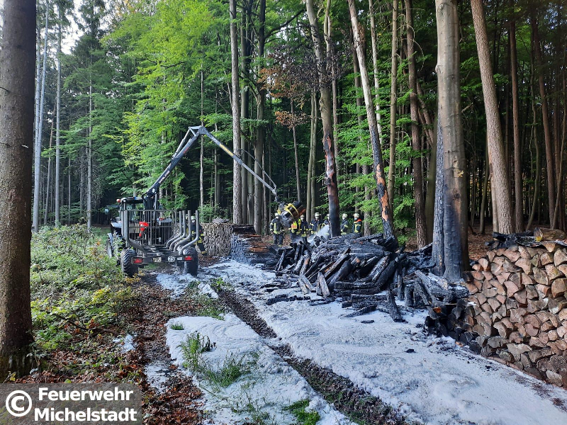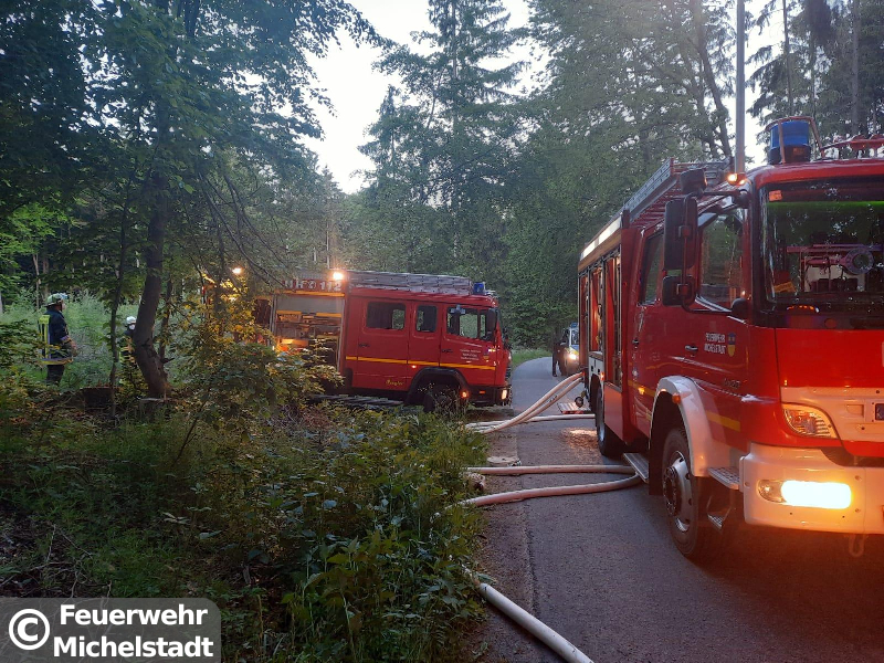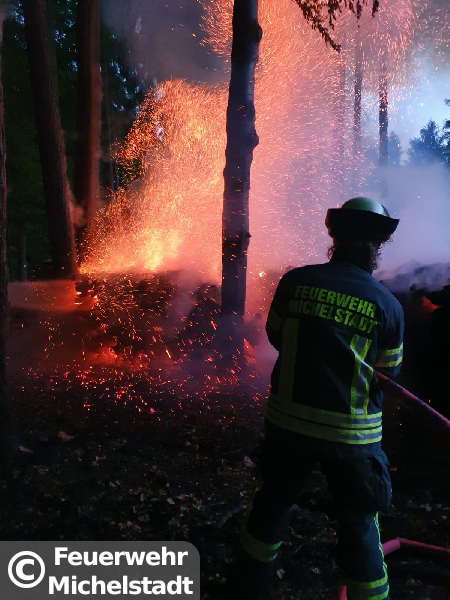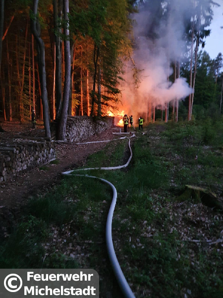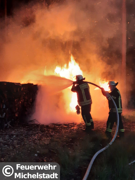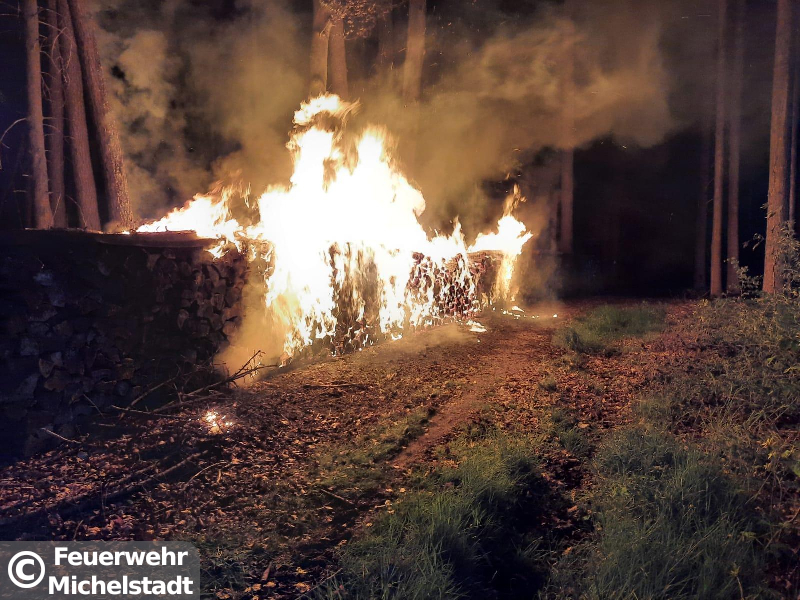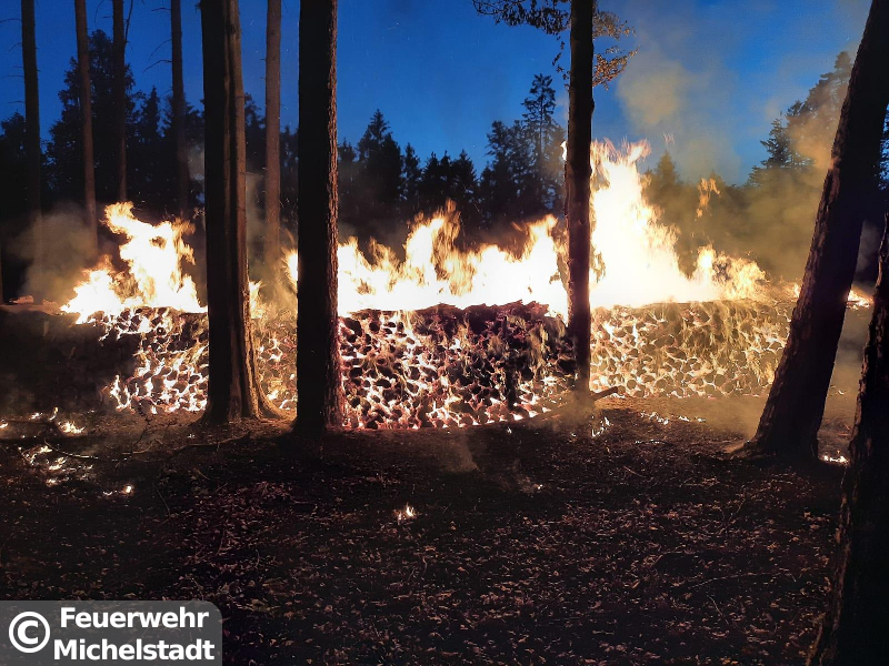 Im Wald brannte ein Holzstapel auf circa 10 x 1 Meter in voller Ausdehnung. Das Feuer wurde zusammen mit den Kameraden aus Vielbrunn mit insgesamt drei Rohren unter Zumischung von Schaum als Netzmittel abgelöscht.