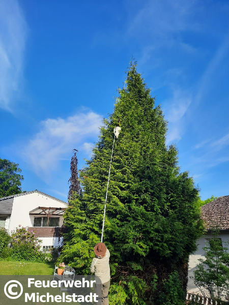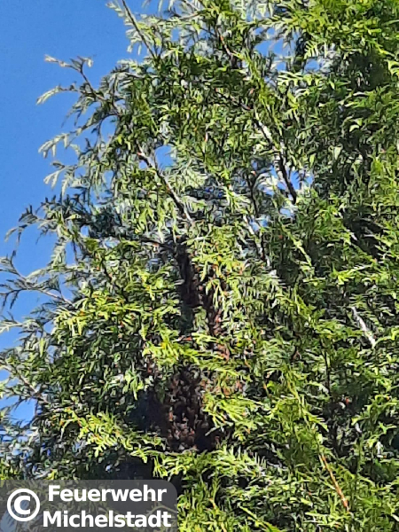 Ein Bienenschwarm ließ sich in einem Baum nieder. Die Einsatzstelle wurde einem Imker übergeben der den Schwarm einfing.