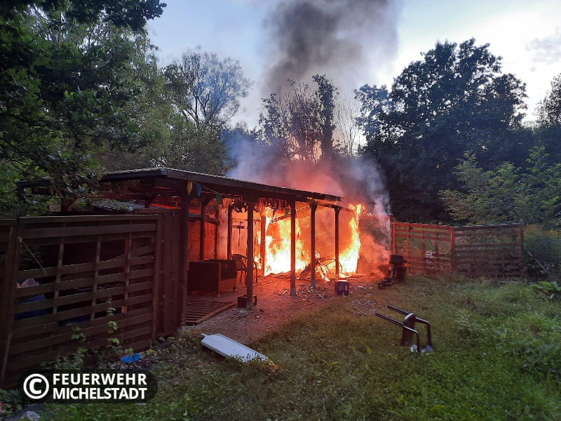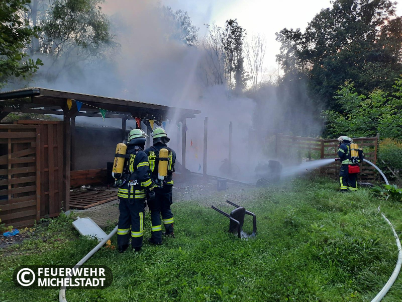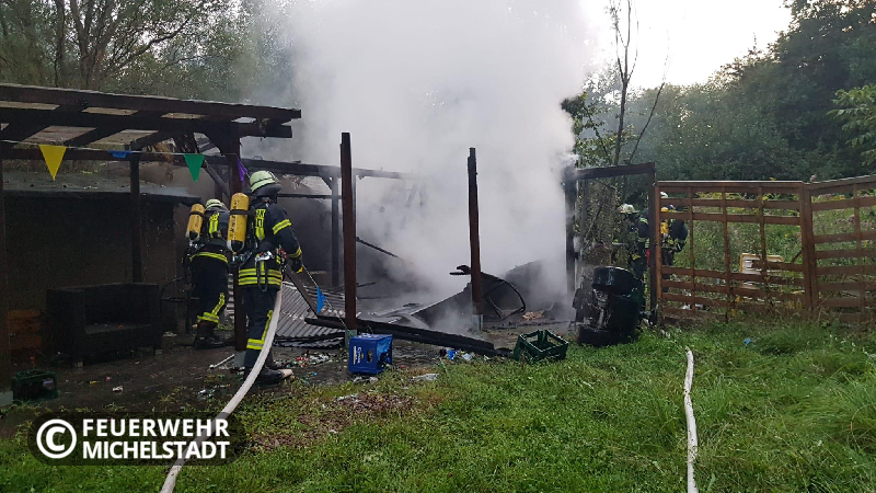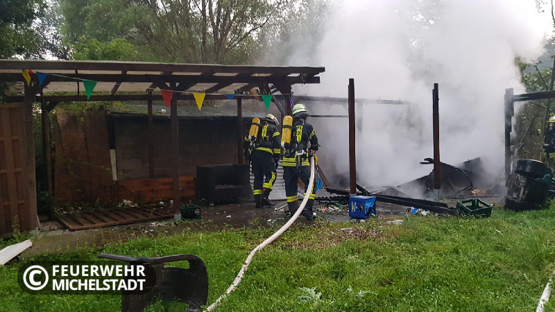 Eine Gartenhütte brannte in voller Ausdehnung. Der Brand wurde mit zwei Trupps unter Atemschutz mit zwei C-Rohren zusammen mit den Kameraden aus Steinbach abgelöscht.