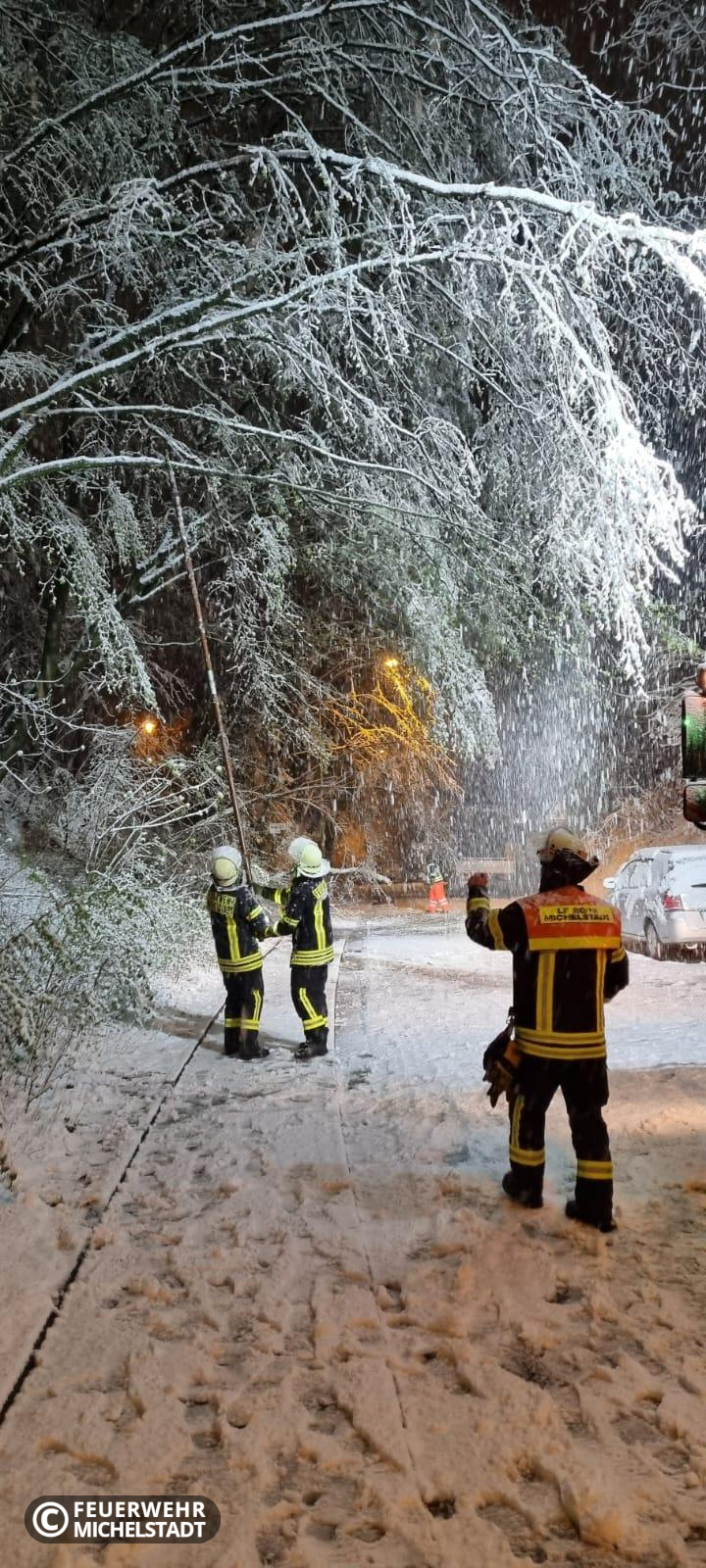 Ein Baum lag quer über der Fahrbahn der Waldstraße. Dieser wurde von uns entfernt. Des Weiteren wurden tief hängende Äste von Schnee befreit.