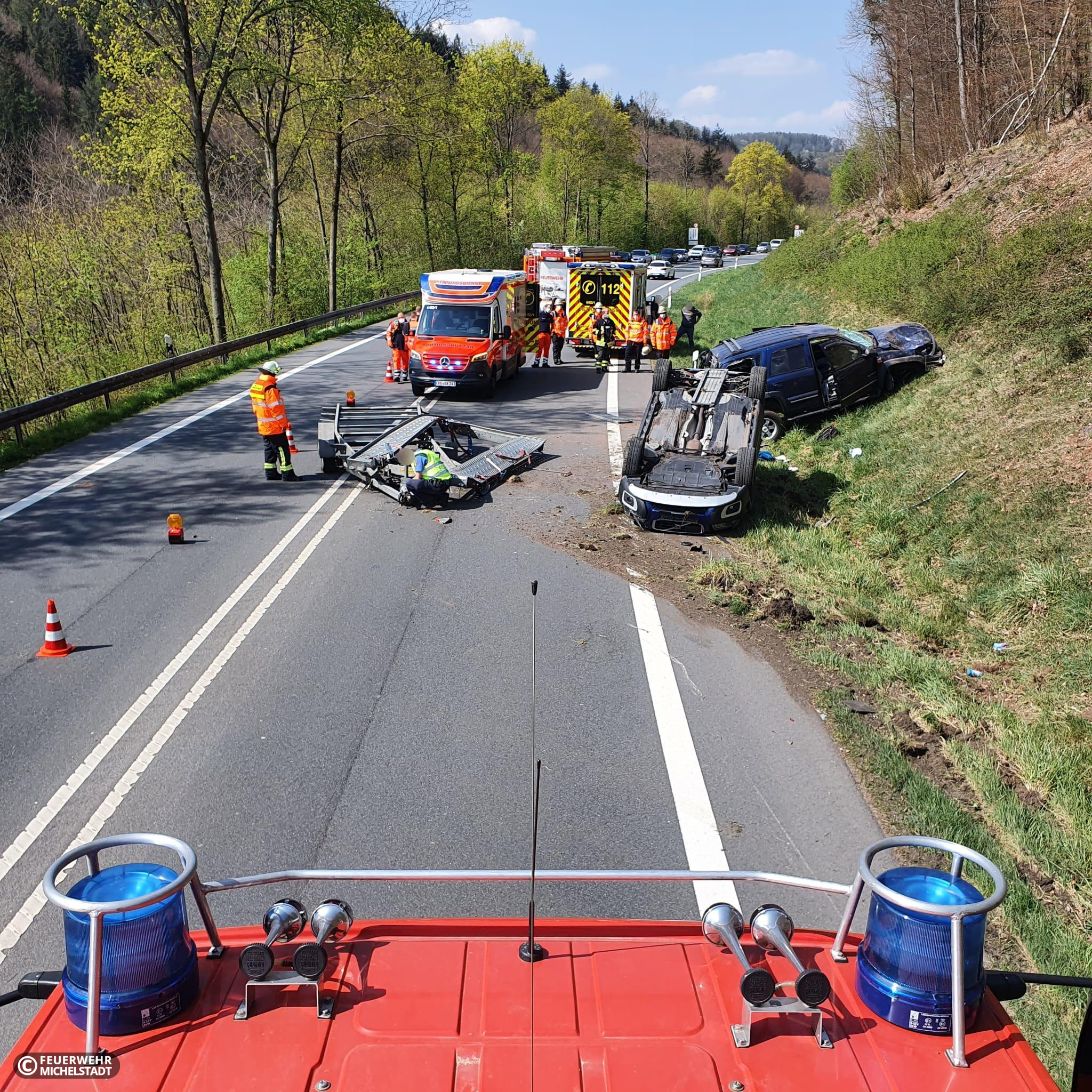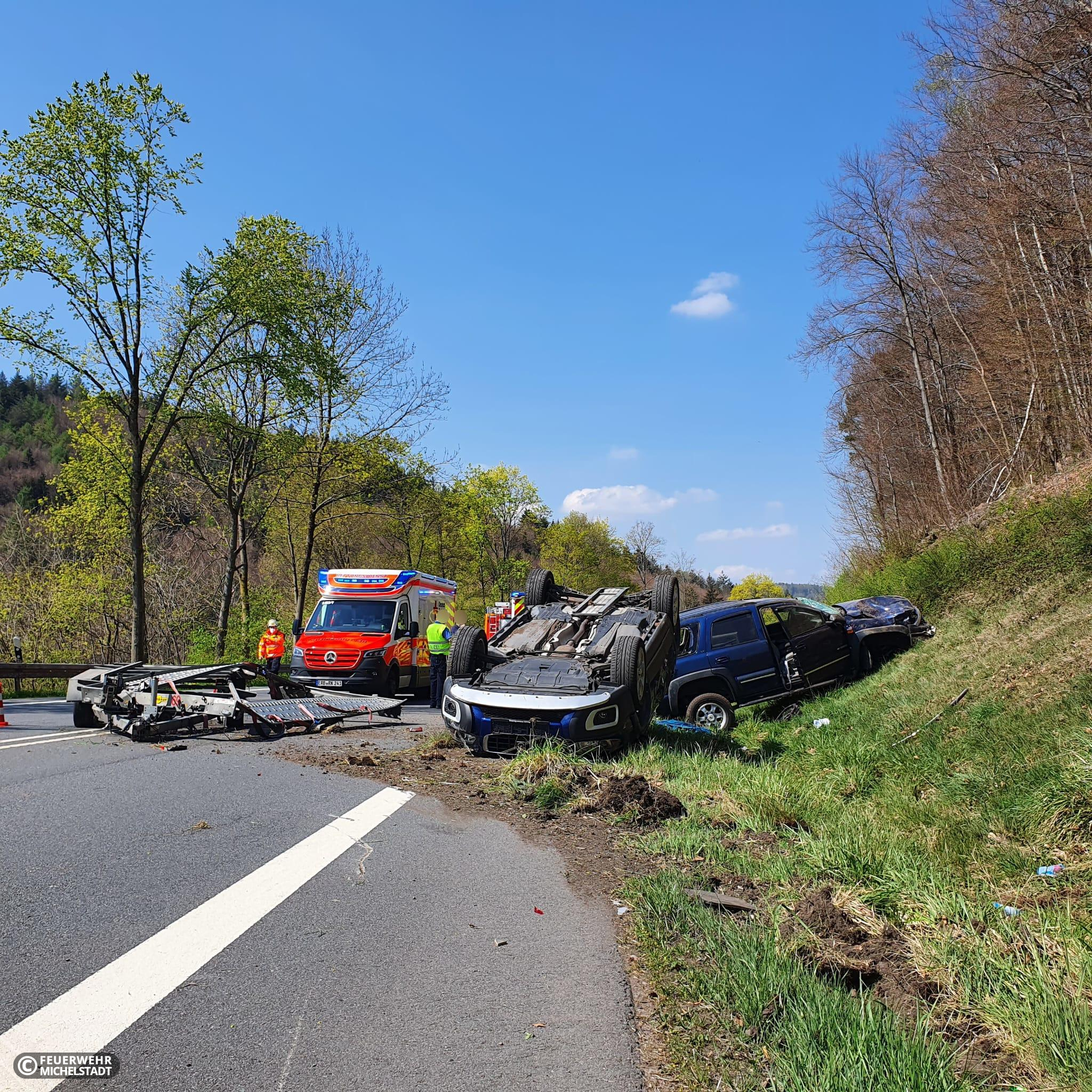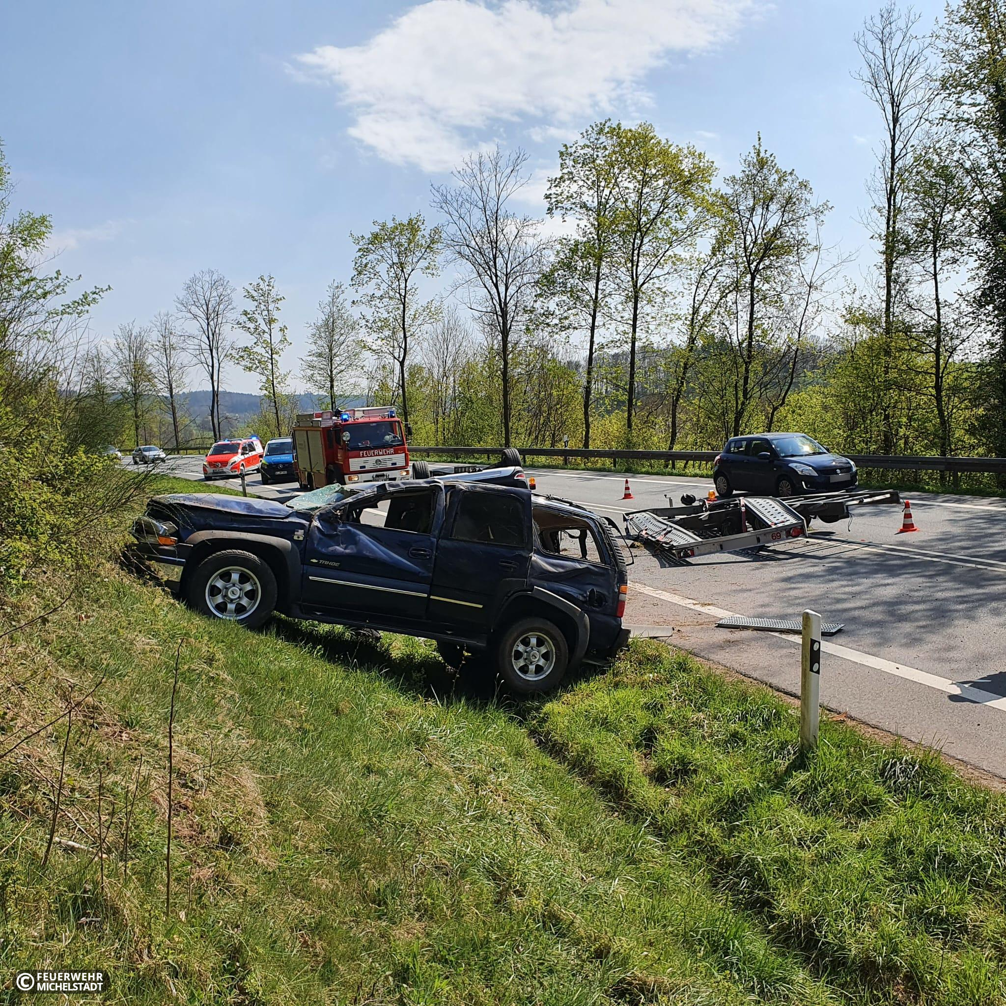 Ein Gespann aus PKW und PKW auf Anhänger überschlug sich, nachdem die fahrende Person die Kontrolle verloren hatte. Eine Person wurde leicht verletzt, jedoch nicht eingeklemmt. Durch uns wurde die Einsatzstelle abgesichert, auslaufende Betriebsstoffe aufgenommen und der Abschleppdienst bei der Bergung unterstützt.