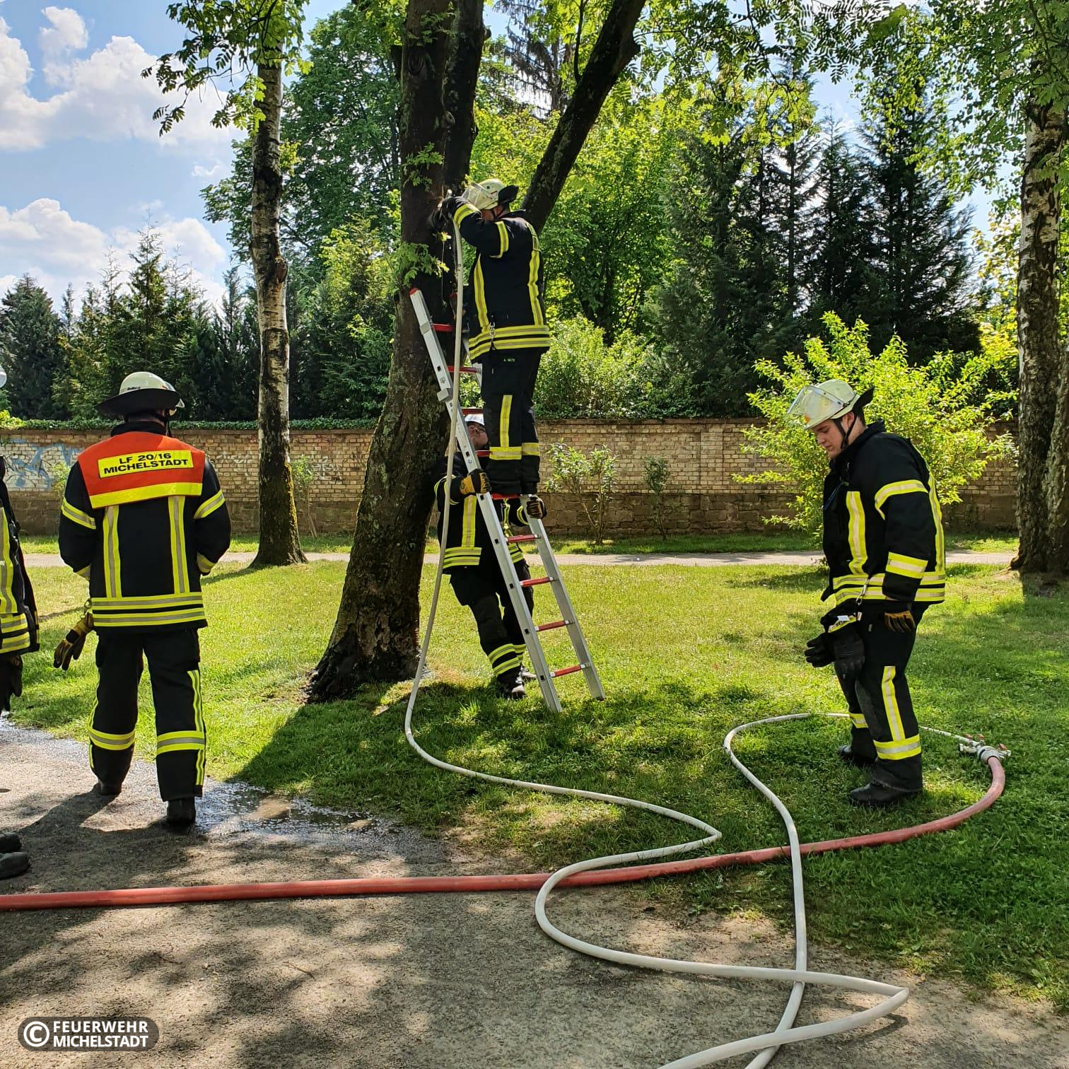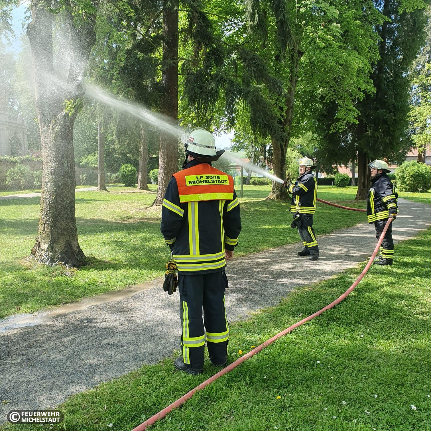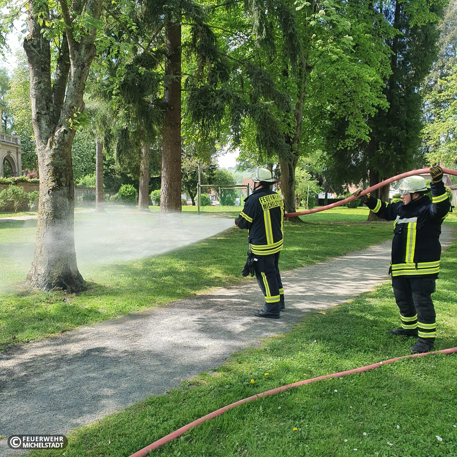 Im Park neben der Odenwaldhalle brannte ein hohler Baum. Dieser wurde mittels C-Hohlstrahlrohr und einem Fognail abgelöscht.