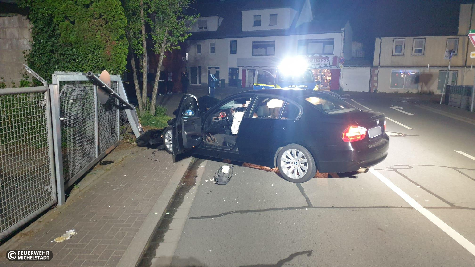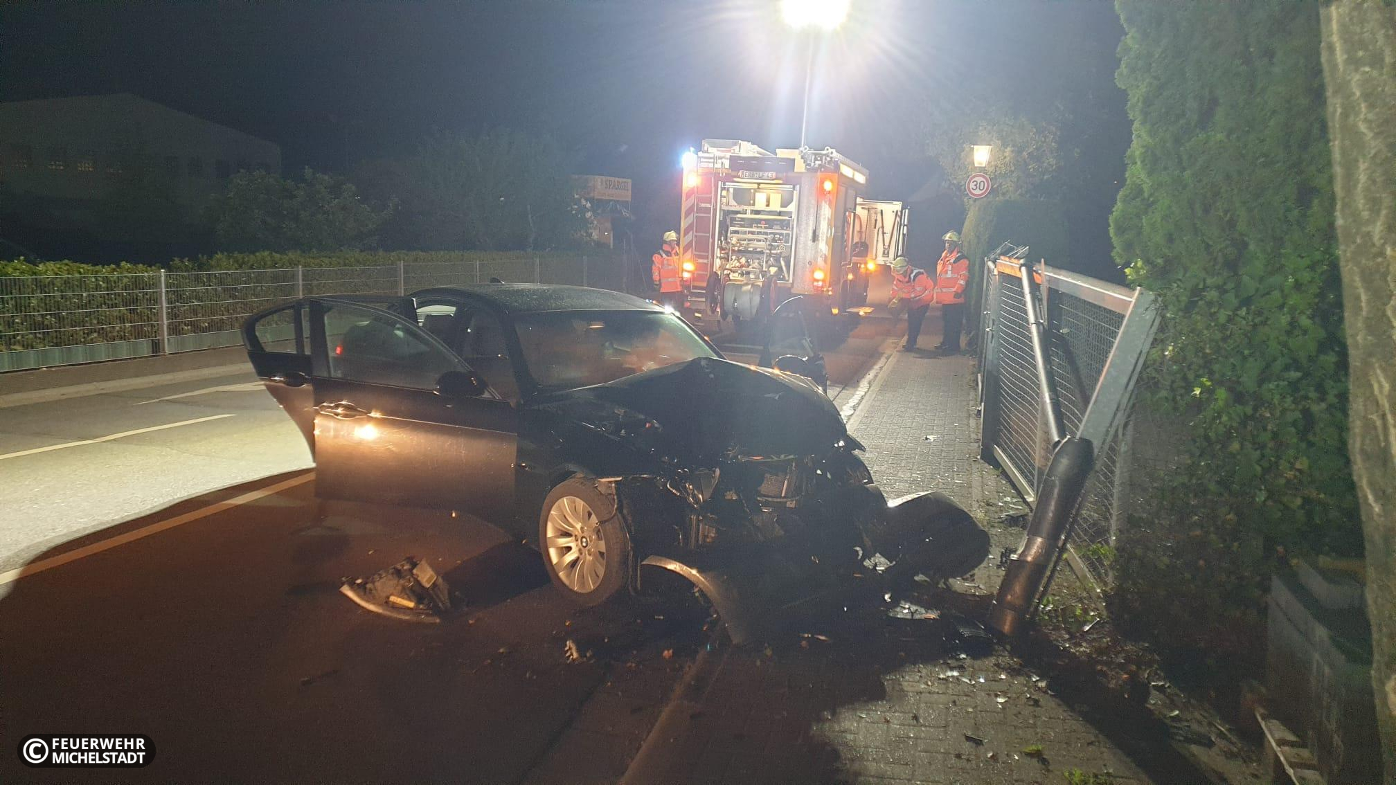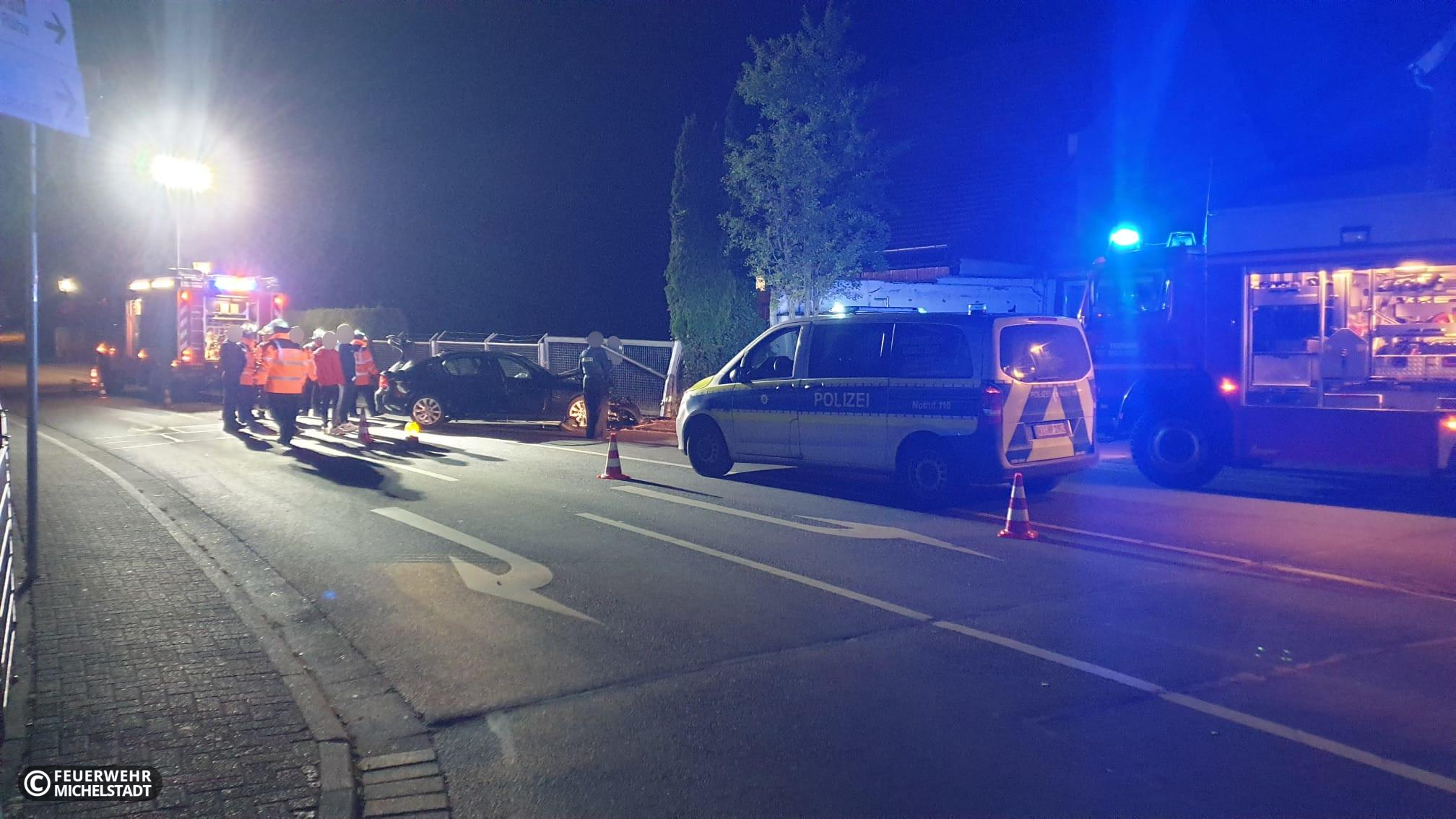 Nach einem Verkehrsunfall leuchteten und sicherten wir die Unfallstelle ab, nahmen auslaufende Betriebsflüssigkeiten auf und unterstützten bei der Bergung des Fahrzeugs und der Laterne.