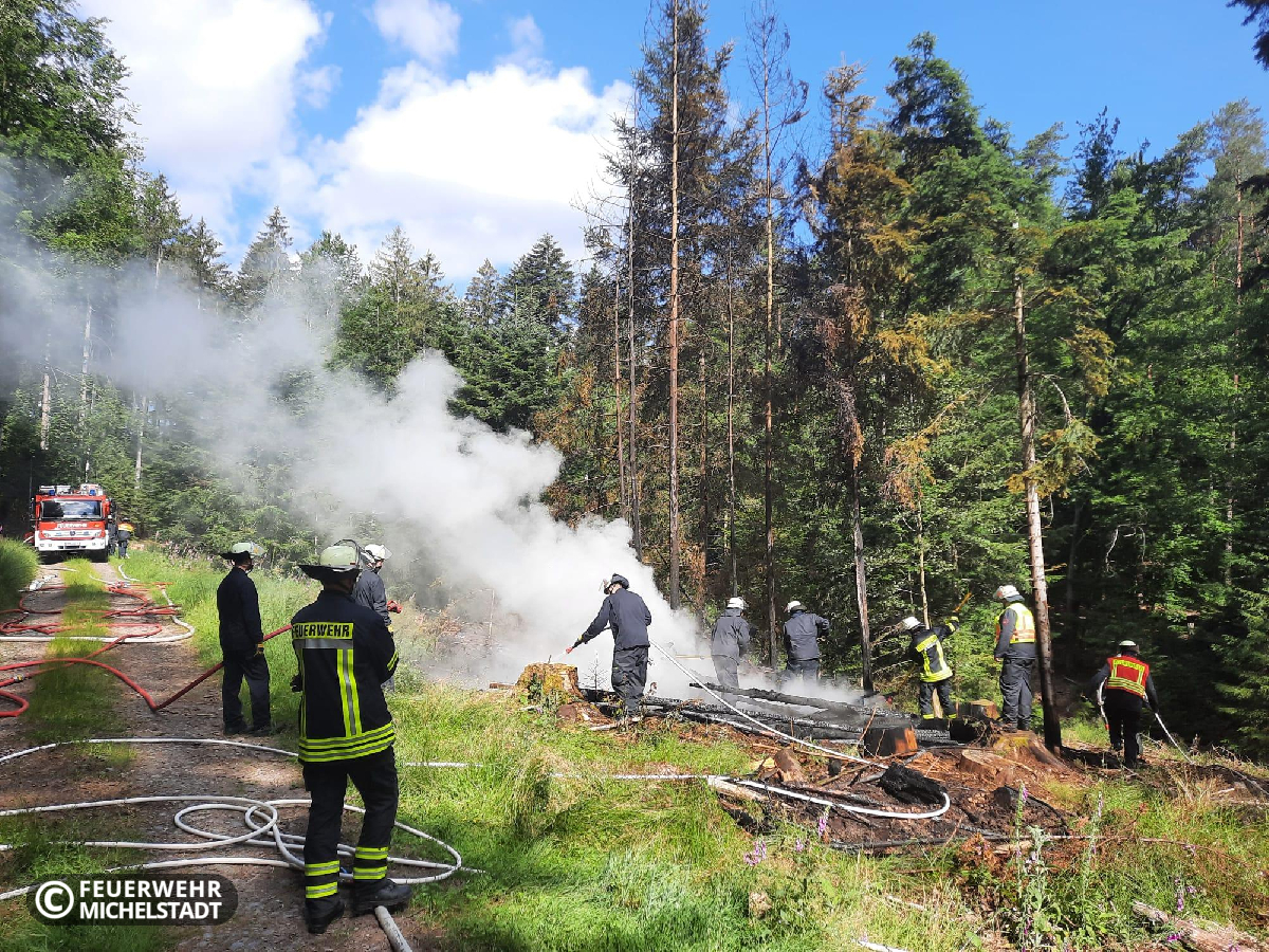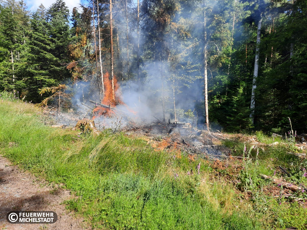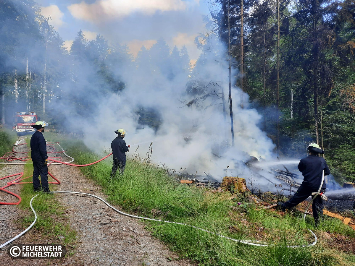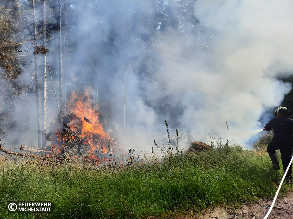 Ein aufgesetzter Haufen mit Reisig ist in Brand geraten. Wir löschten das Feuer zusammen mit den Kameraden aus Stockheim mit insgesamt 2 D- und 2 C-Rohren ab.