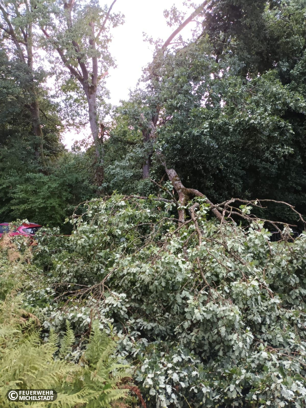 Ein Baum war über die Fahrbahn gestürzt. Wir entfernten gemeinsam mit den Kameraden aus Steinbach den Stamm von der Fahrbahn. Zusätzlich befreiten wir mit der Drehleiter einen Teil eines Baumes, der an einem Haus lehnte.