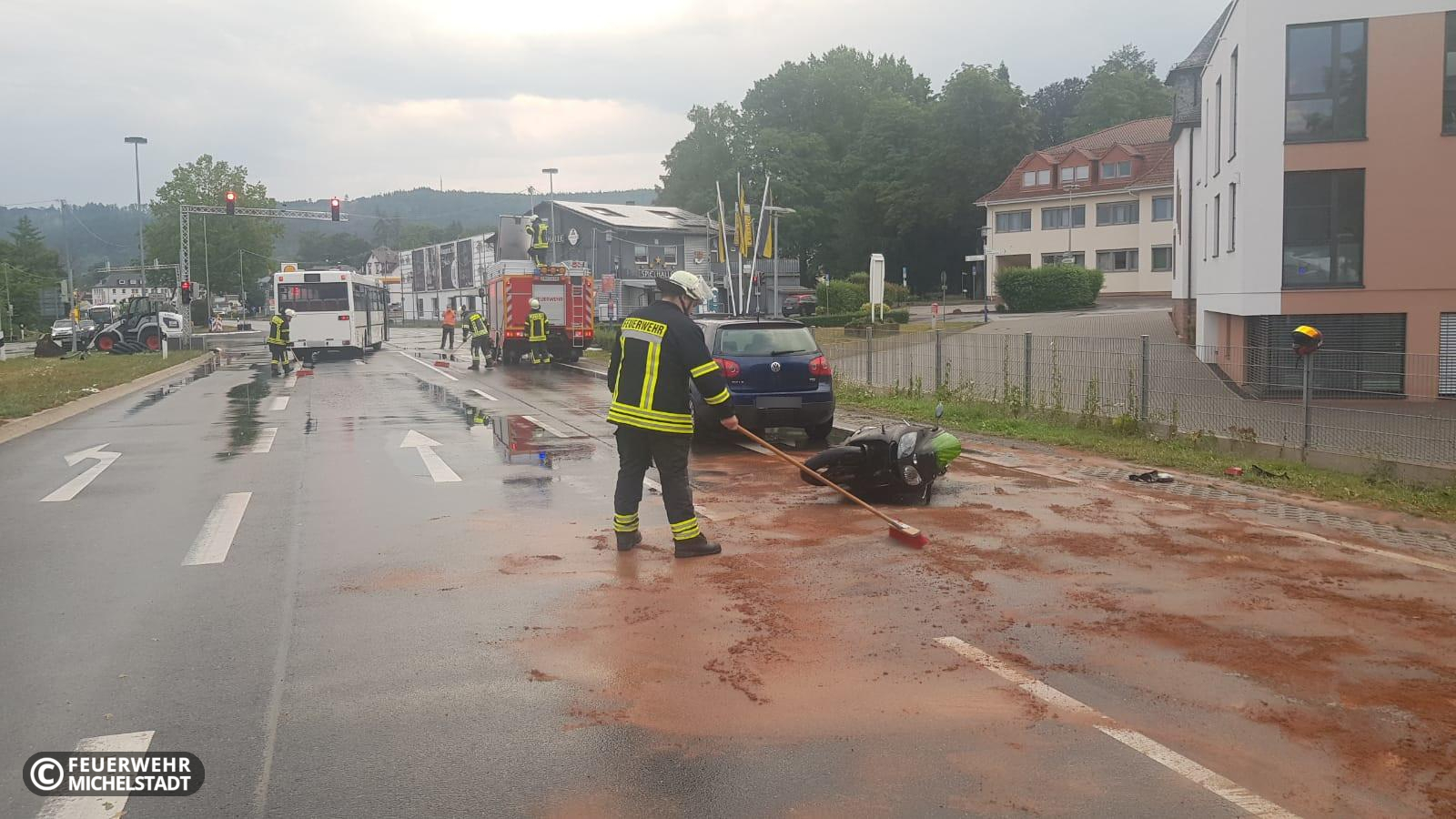 Ein Linienbus, PKW und Motorrad sind miteinander verunfallt. Von uns wurde die Einsatzstelle abgesichert und die ausgelaufenen Betriebsstoffe aufgenommen.