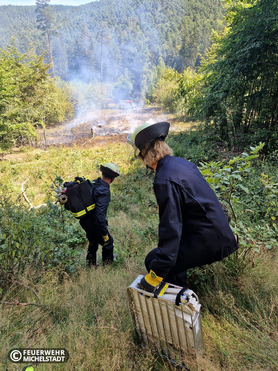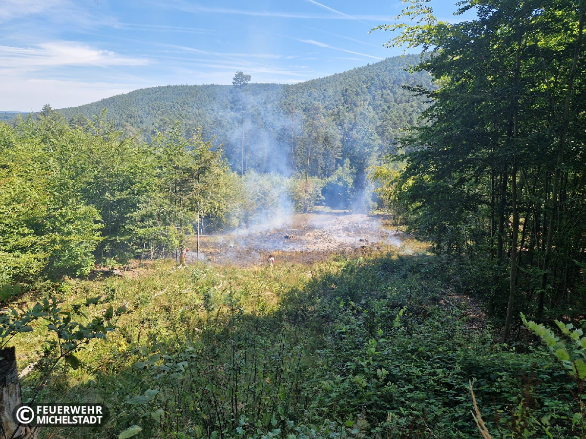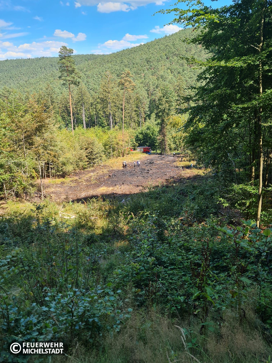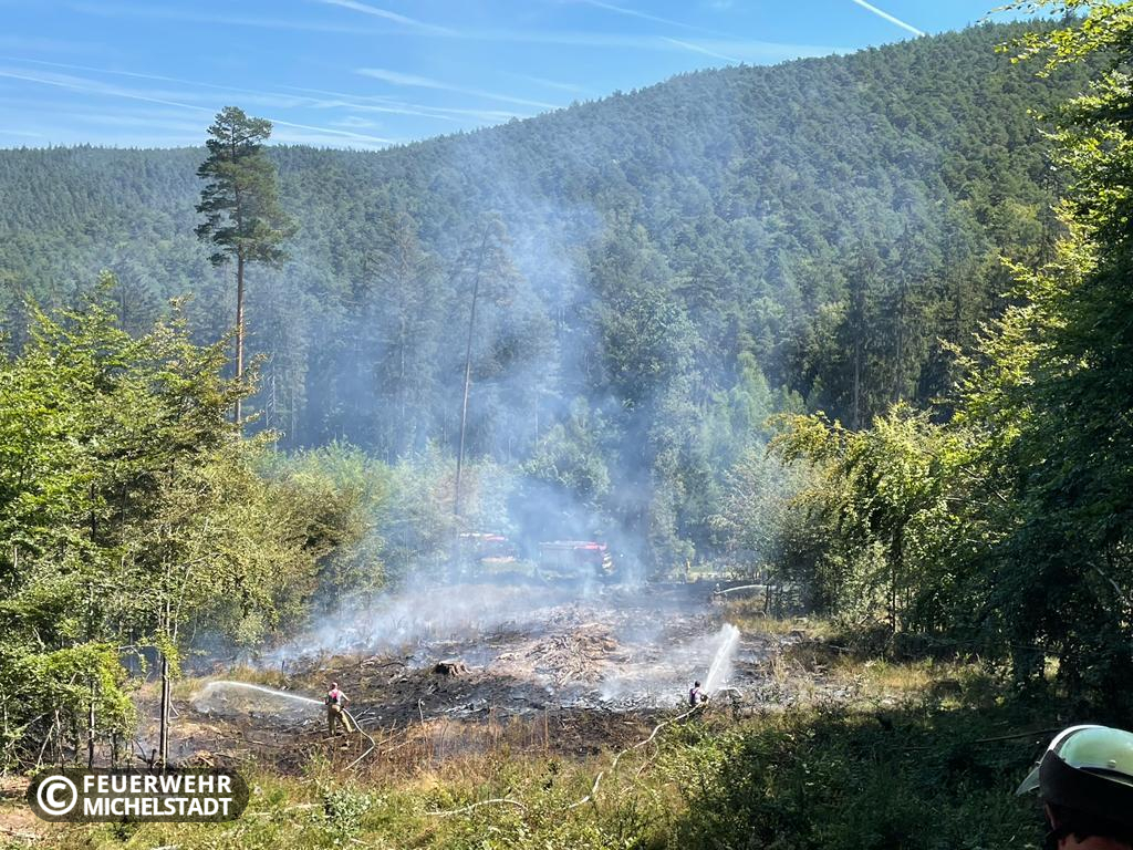 An der Landesgrenze Hessen/Bayern brannte eine gerodete Fläche von ca. 200 x 50 Meter. Das Feuer wurde durch ein Ultraleichtflugzeug entdeckt und der zuständigen Leitstelle gemeldet. Durch die eingesetzten Kräfte wurde das Feuer von zwei Seiten bekämpft. Dabei arbeiteten wir mit den Kameraden aus Bayern zusammen. Aufgrund der schwierigen Erreichbarkeit der Brandstelle wurden mehrere Tanklöschfahrzeuge im Pendelverkehr eingesetzt, um Wasser aus Bremhof, sowie Laudenbach zur Einsatzstelle zu bringen. Zusätzlich kam in der Erkundungsphase die Drohne der Kameraden aus Bad König zum Einsatz.
