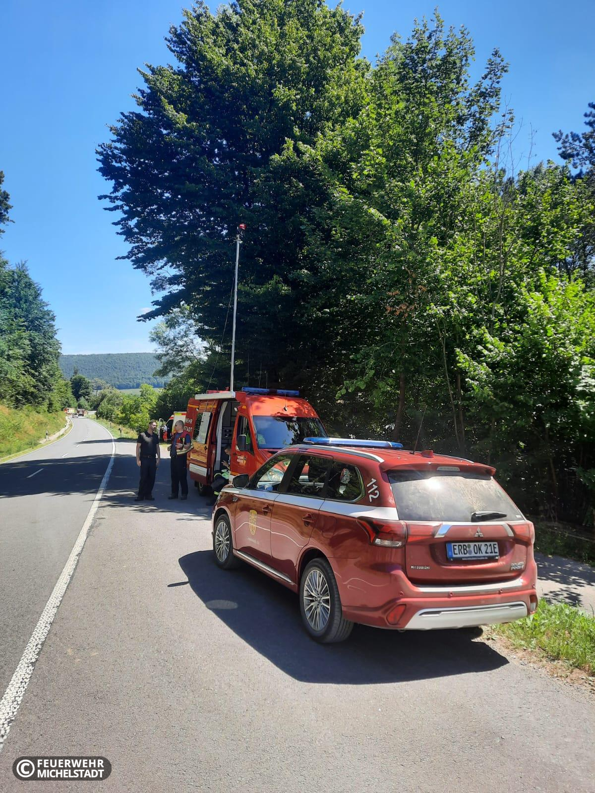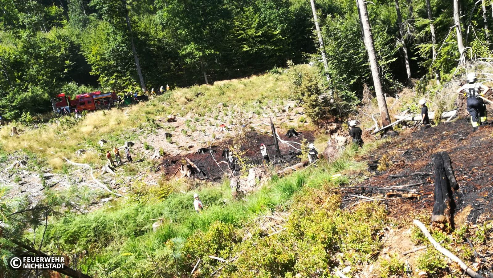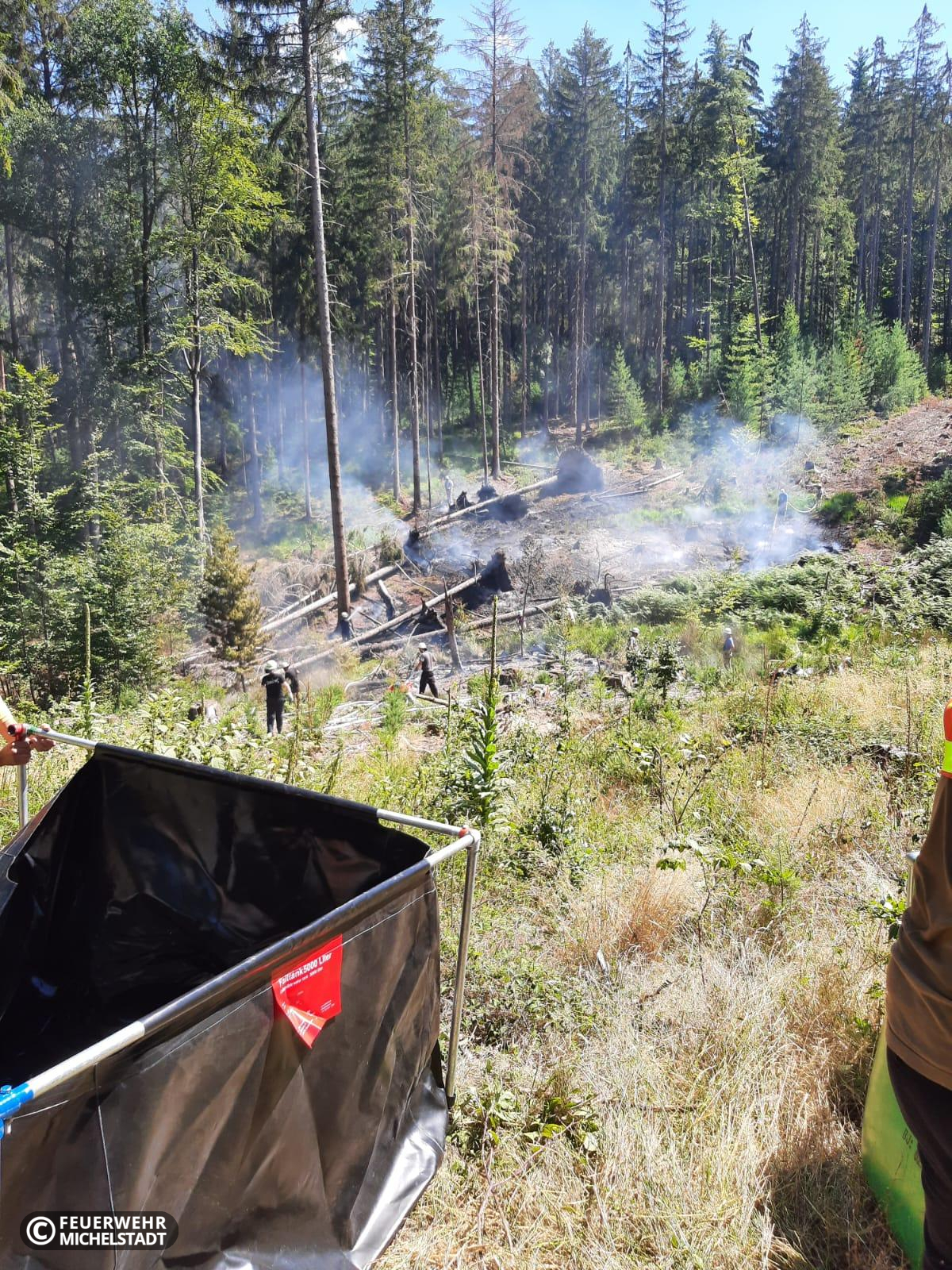 Während wir die Ölspur abarbeiteten, wurden wir erneut zu einem Waldbrand zwischen Bremhof und Laudenbach alarmiert. Die neue Brandstelle befand im gleichen Bereich wie die Brandstelle von ein paar Tagen zuvor. Erneut unterstützten wir die Kameraden mit Personal und der Löschwasserzuführung im Pendelverkehr. Durch unseren Einsatzleitwagen wurde zudem der Bereitstellungsraum geführt.