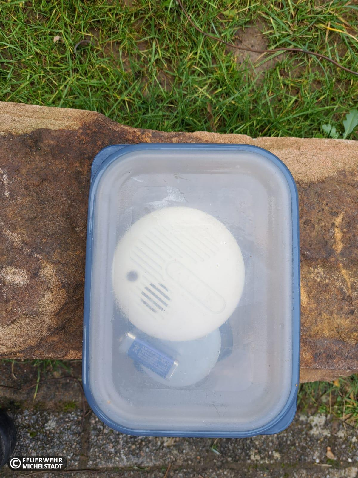 Wir wurden zu einem ausgelösten Heimrauchmelder alarmiert. Vor Ort war dieser von außen deutlich zu hören. Bei der Erkundung konnte der Heimrauchmelder bei der Erkundung mit der Drehleiter in einer Brotdose verpackt auf einem Balkon aufgefunden und deaktiviert werden.