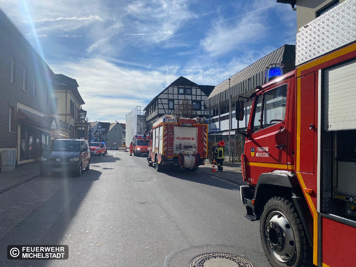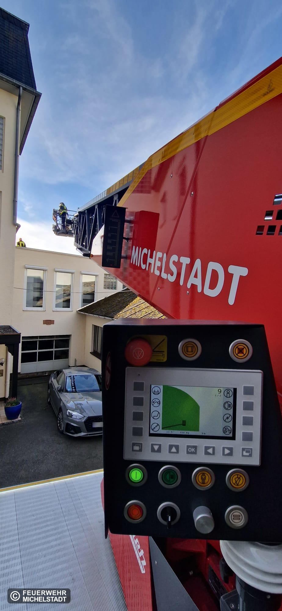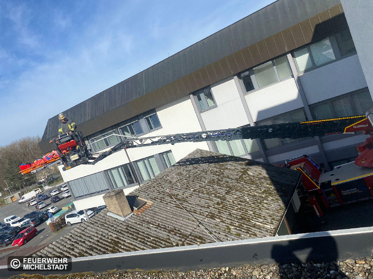 Bei Bauarbeiten ist eine Person auf ein tieferliegendes Dach gestürzt. Nach der Versorgung durch den Rettungsdienst erfolgte die technische Rettung über die Drehleiter.
