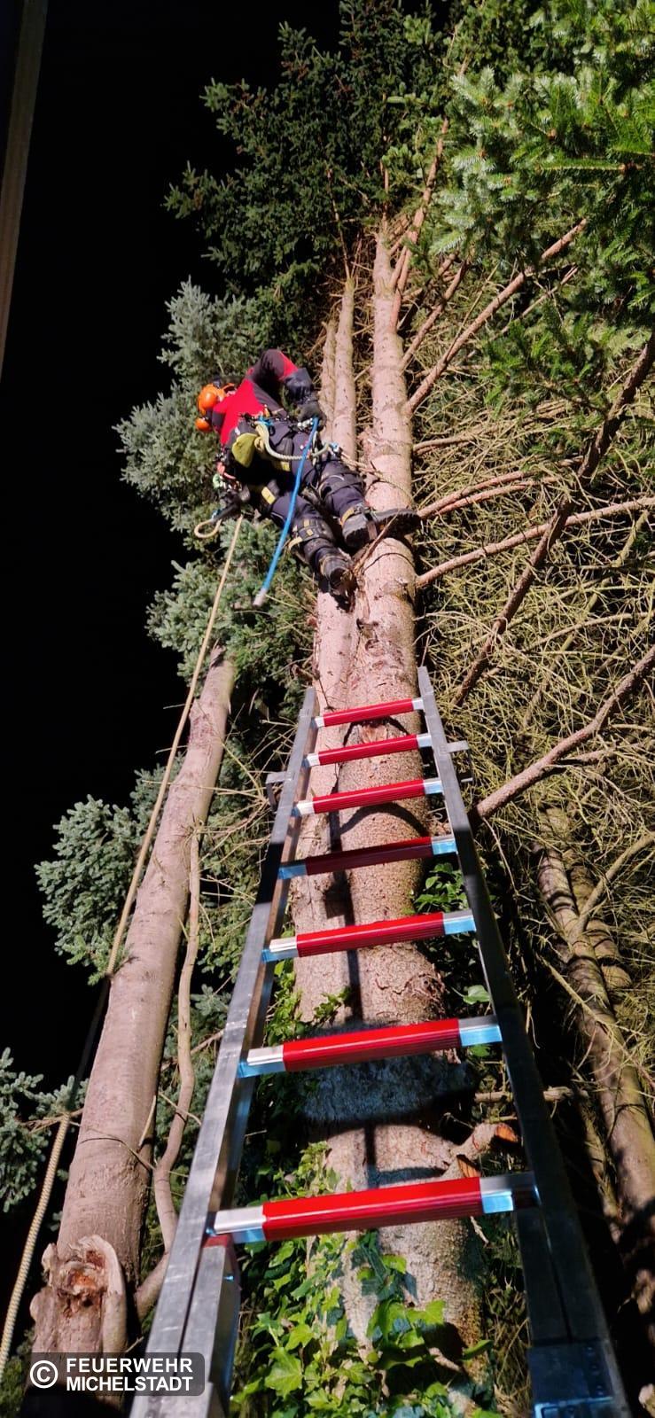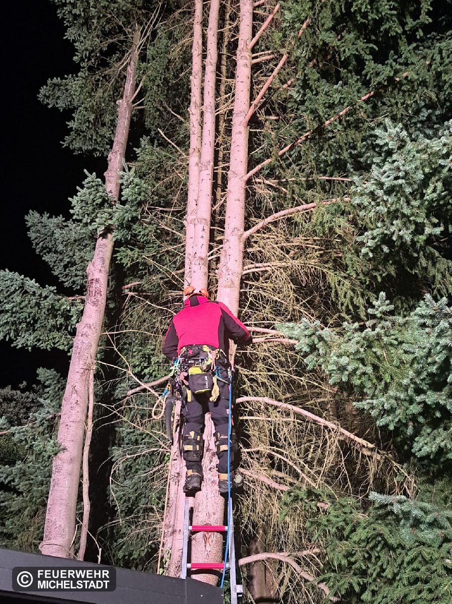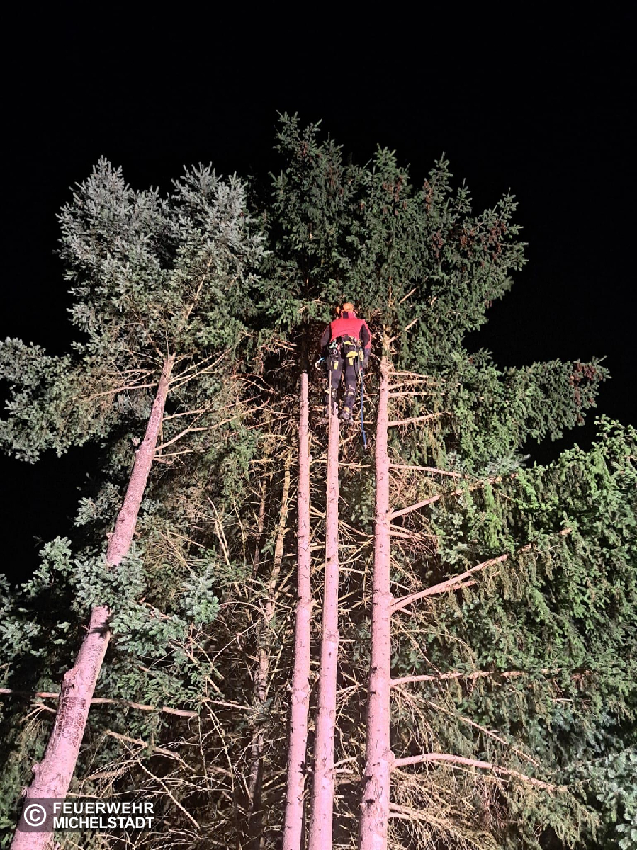Wir wurden zu einem unbekannten Tier in einem Baum gerufen, das sich durch Laute bemerkbar machte. Aufgrund der Situation vor Ort wurde eine Michelstädter Fachfirma für Klettertechnik dazugerufen. Wir leuchteten die Einsatzstelle aus. Trotz Einsatz der Wärmebildkamera konnte kein Tier gefunden werden.