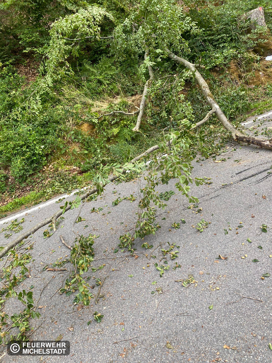 Ein Baum versperrte zur Hälfte die Fahrbahn. Da das TSF-W Weiten-Gesäß nicht verfügbar war, forderte der Einsatzleiter unseren Rüstwagen nach. Wir beseitigten den Baum mit der Kettensäge und unterstützten die Kameraden aus Weiten-Gesäß bei der Reinigung der Fahrbahn.