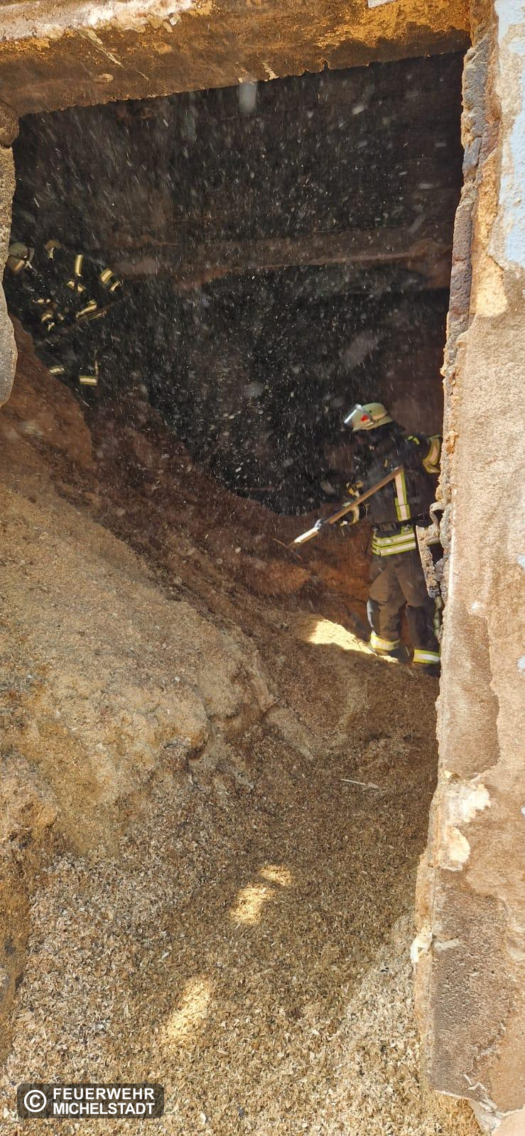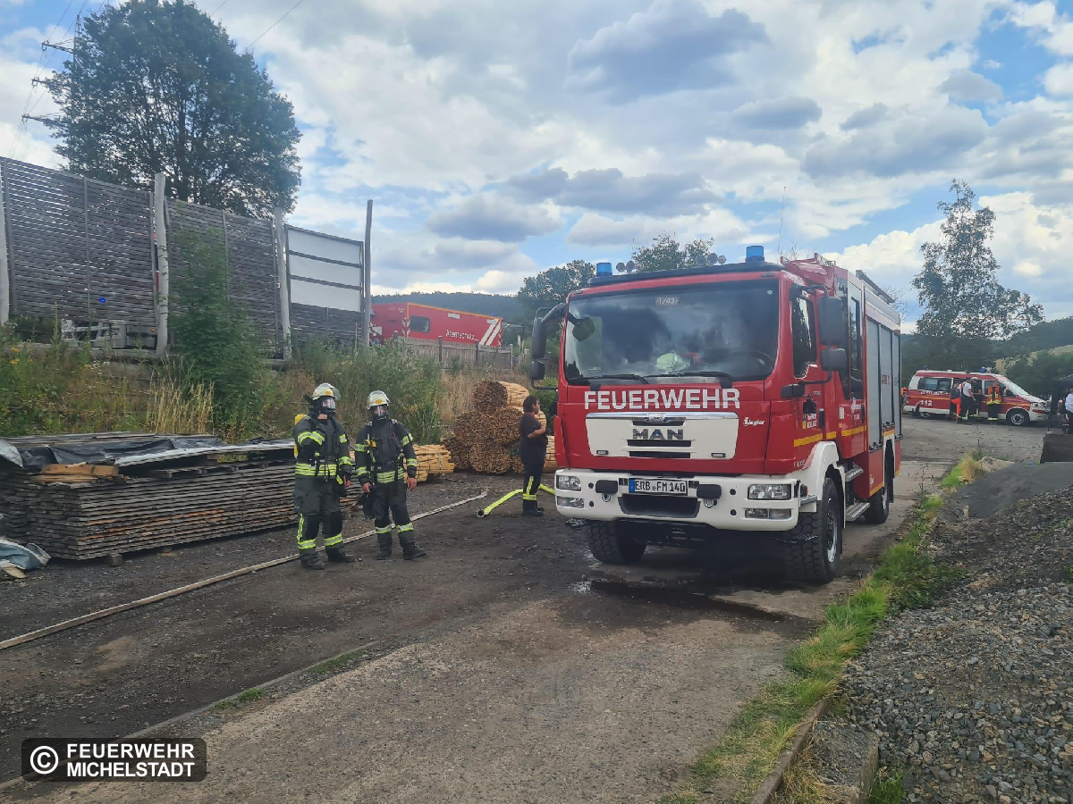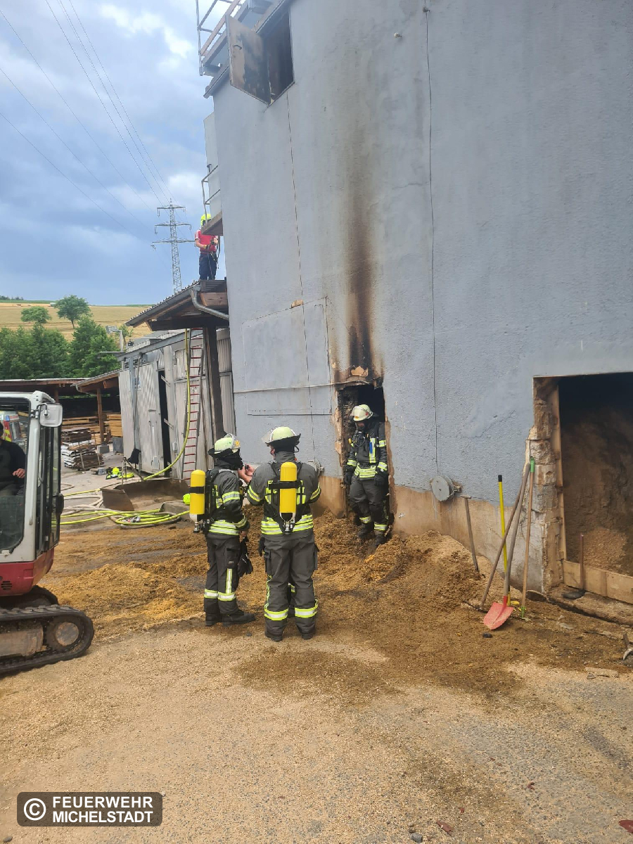 Da das Spänelager des vorherigen Einsatzes nicht abgelöscht werden konnte, ohne dieses zu leeren, wurden wir mit Atemschutzgeräteträgern alarmiert, um den immensen Kräftebedarf zu decken. Vor Ort lösten wir die Kameradinnen und Kameraden ab, die bereits seit den Morgenstunden mit dieser Aufgabe beschäftigt waren. Insgesamt setzten wir zwei mal vier Trupps ein, welche jeweils 20 bis 30 Minuten im Einsatz waren. In Handarbeit wurde so über den Tag das gesamte Lager entleert. Wir wurden gegen etwa 17 Uhr durch Einsatzkräfte der Feuerwehr Höchst abgelöst.