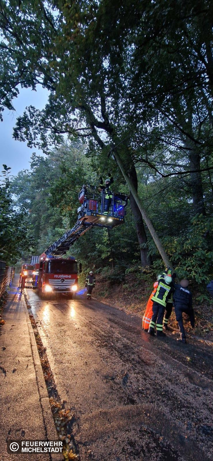 Im Bereich des Waldschwimmbads lag ein abgebrochener Telefonmast auf der Straße. Mithilfe der Drehleiter und Muskelkraft legten wir den Mast auf die Seite und sicherten diesen mit einer Leine.
