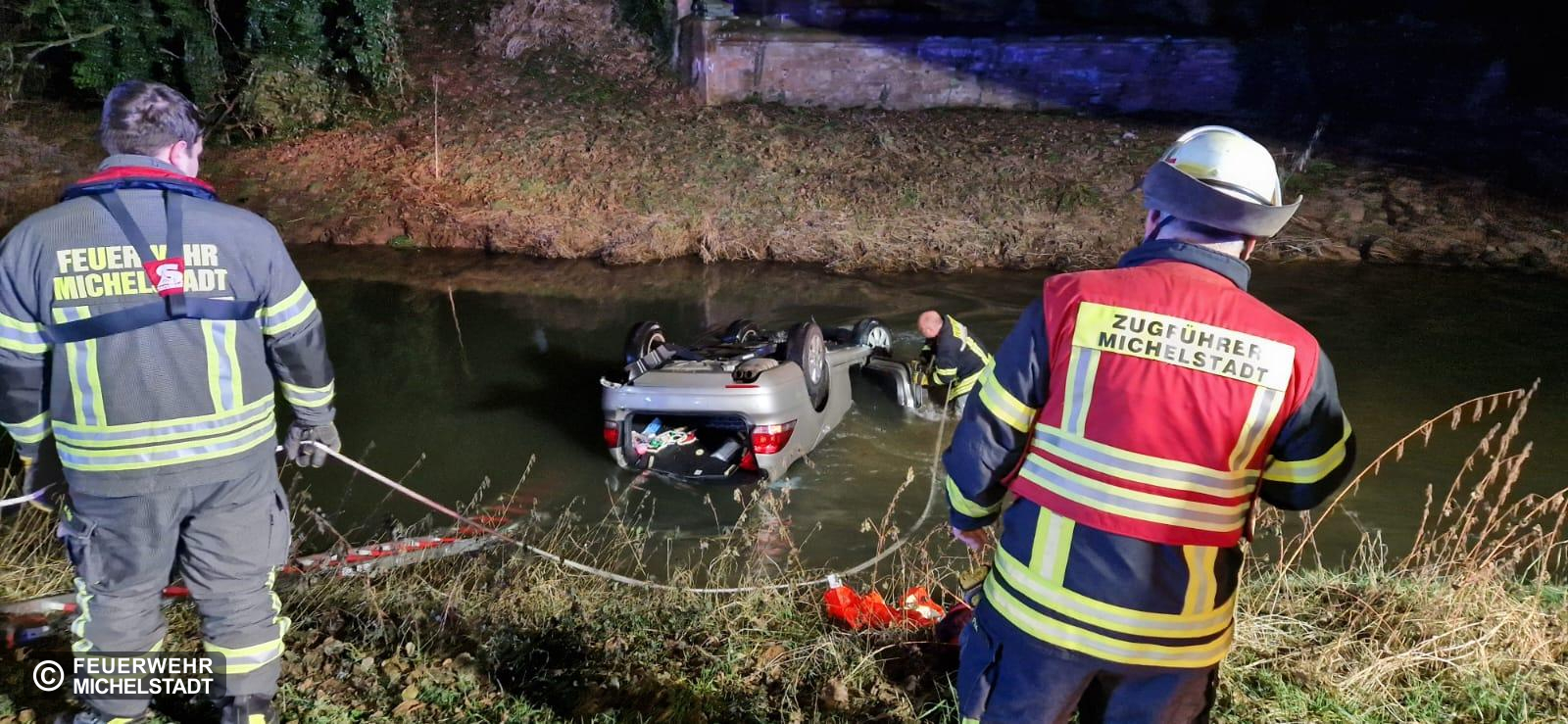 Eine Person kam mit ihrem PKW von der Fahrbahn ab. Der PKW landete in der Mümling. Die Person konnte sich selbstständig befreien. Nach unserem Eintreffen betreuten wir die Person bis zum Eintreffen des Rettungsdienstes. Außerdem sicherten wir die Einsatzstelle ab und leuchteten diese aus. Abschließend unterstützten wir das Bergungsunternehmen bei der Bergung des PKW.