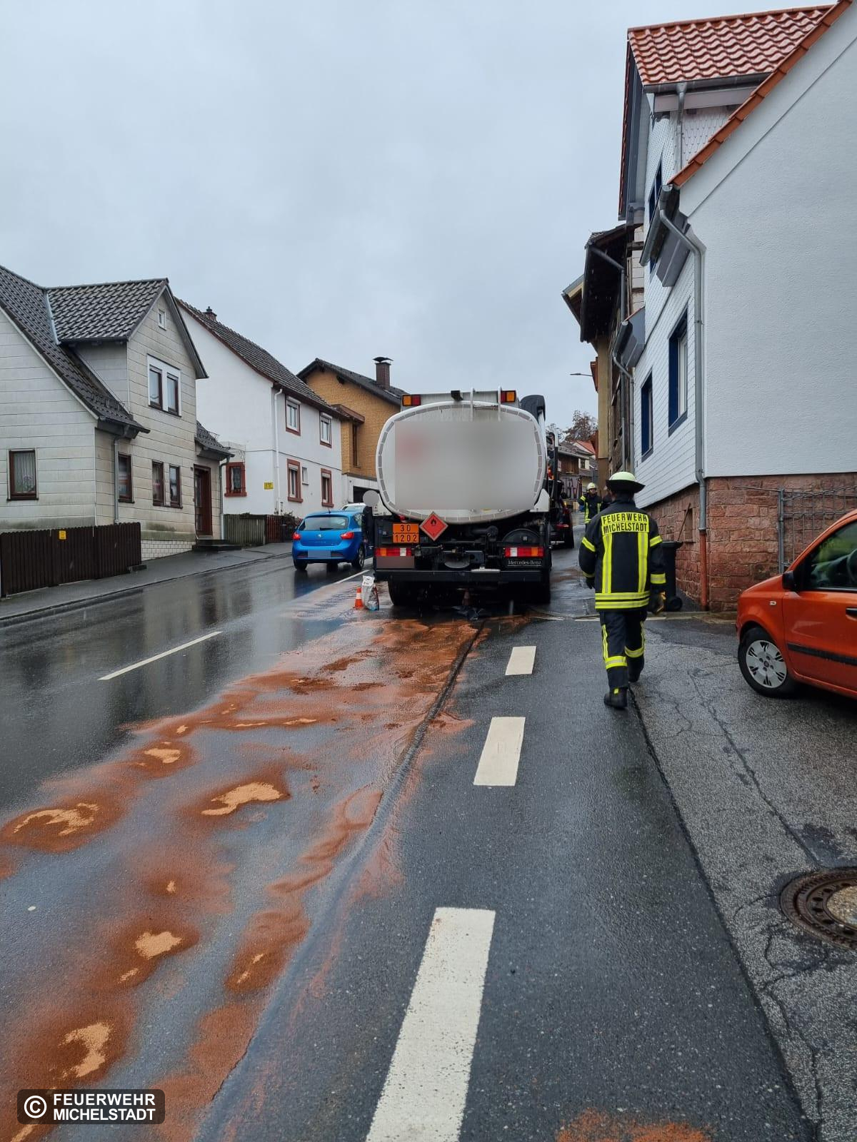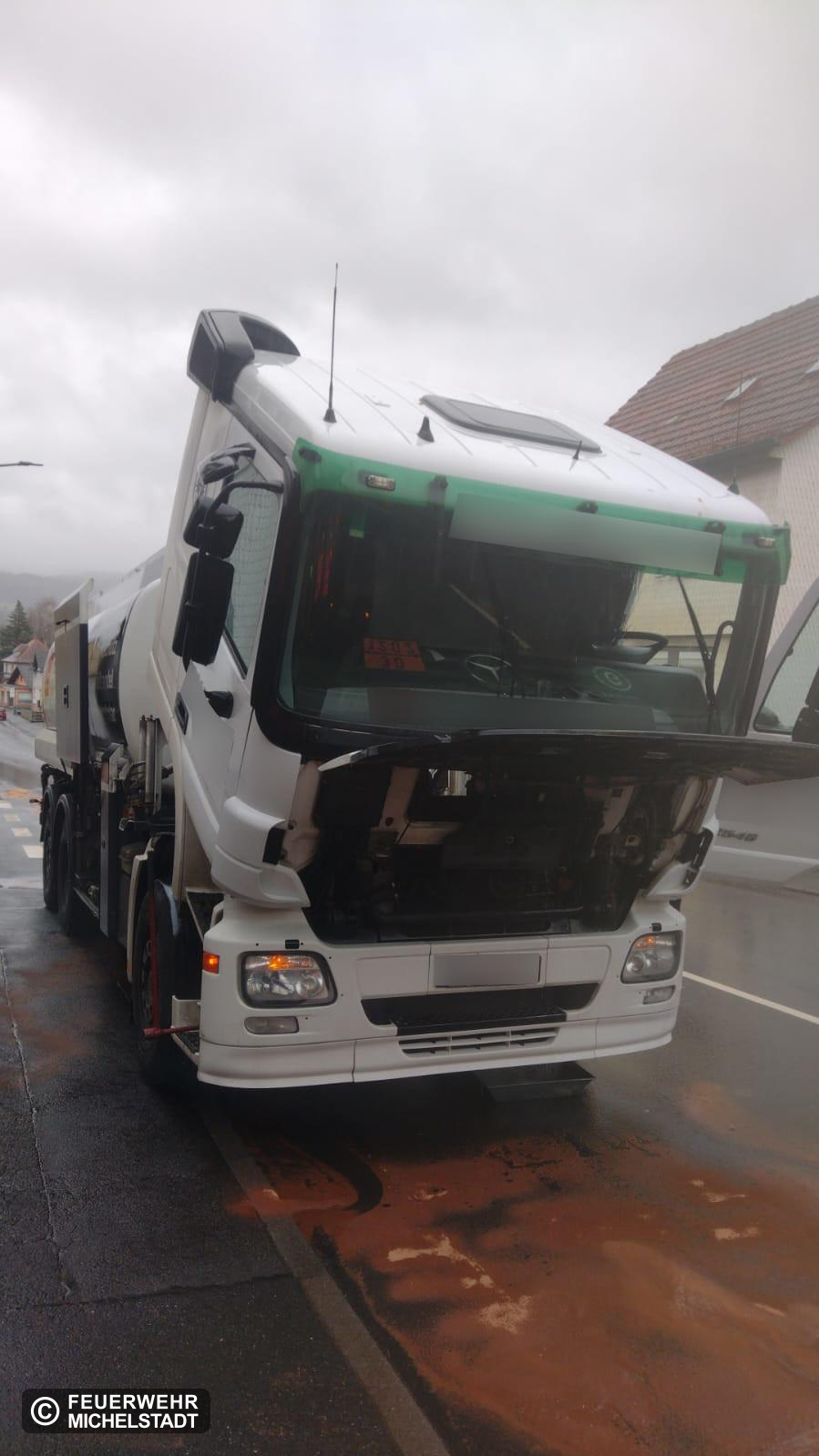 Bei einem LKW war der Hydraulikschlauch der Lenkung geplatzt. Das ausgetretene Öl verursachte eine Verschmutzung auf etwa 200 Metern. Wir streuten die betroffen Stellen ab.
