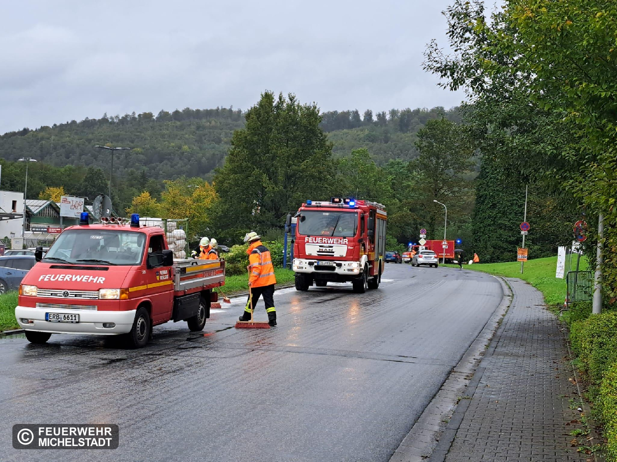 Eine Ölspur zog sich von der Kreisgrenze Darstadt-Dieburg bis nach Michelstadt auf einen Betriebshof. Auf den innerstädtischen Straßen Abfahrt Rewe Center und Walther-Rathenau-Allee wurde die Ölspur durch uns und Kameraden der Feuerwehr Steinbach abgestreut.
