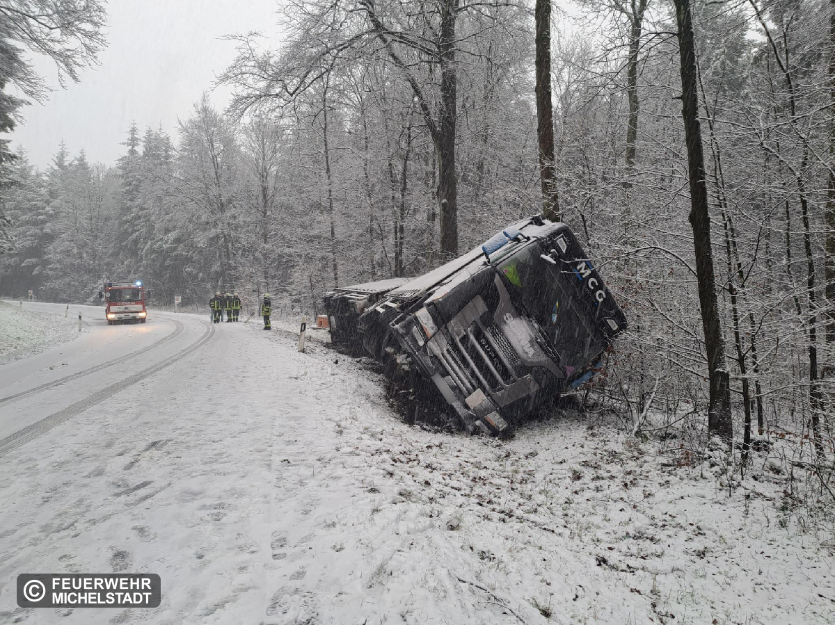 Gemeldet wurde ein LKW Sattelzug im Graben auf der Fahrerseite, unklar ob der Fahrer eingeklemmt ist. Beim Eintreffen war der Fahrer bereits aus dem Fahrzeug befreit. Da der LKW Sattelzug außerhalb der Fahrbahn lag und keine Betriebsstoffe ausliefen, war kein weiterer Einsatz notwendig.
