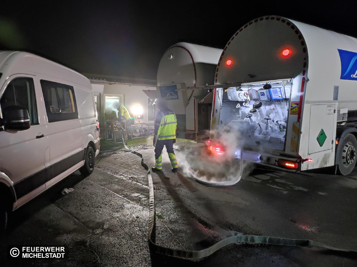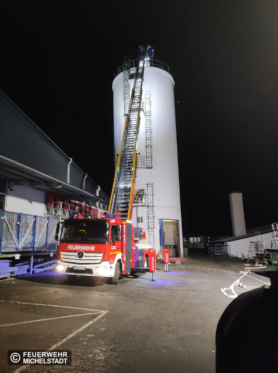Die Kameraden aus Bad König stellten im weiteren Einsatzverlauf Gerät zum Ausleuchten der Einsatzstelle bereit. Des Weiteren brachte die Feuerwehr Erbach eine Löschlanze an die Einsatzstelle, die den Anforderungen der Fachfirmen entsprach. Wir unterstützten die Fachfirmen beim Anbringen der Messgeräte und der Löschlanze mittels Drehleiter. Die Feuerwehr Vielbrunn stellte den Brandschutz sicher, bis von den Fachfirmen Entwarnung bezüglich der Explosionsgefahr gegeben werden konnte.