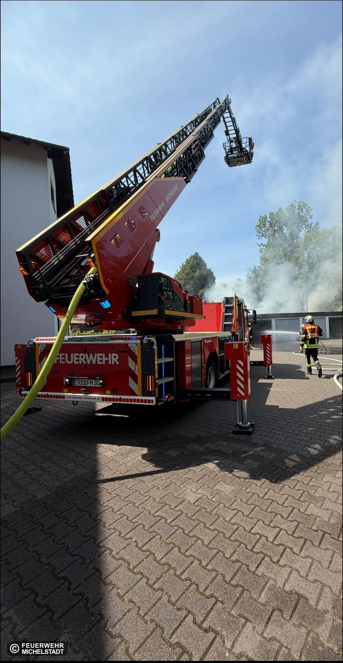 Gemeldet war ein brennendes Gartenhaus. Bei Eintreffen stand das Gartenhaus mit Anbau in Vollbrand und breitete sich schon auf den Dachbereich von 8 Fertiggaragen sowie den Böschungsbereich aus. Insgesamt wurden 3 C- Rohre unter anderem aus der DLK eingesetzt. Die Fertiggaragen wurden teilweise gewaltsam geöffnet und ausgeräumt. Das Blechdach wurde mittels Säbelsäge geöffnet um die Holzbalken ablöschen zu können.